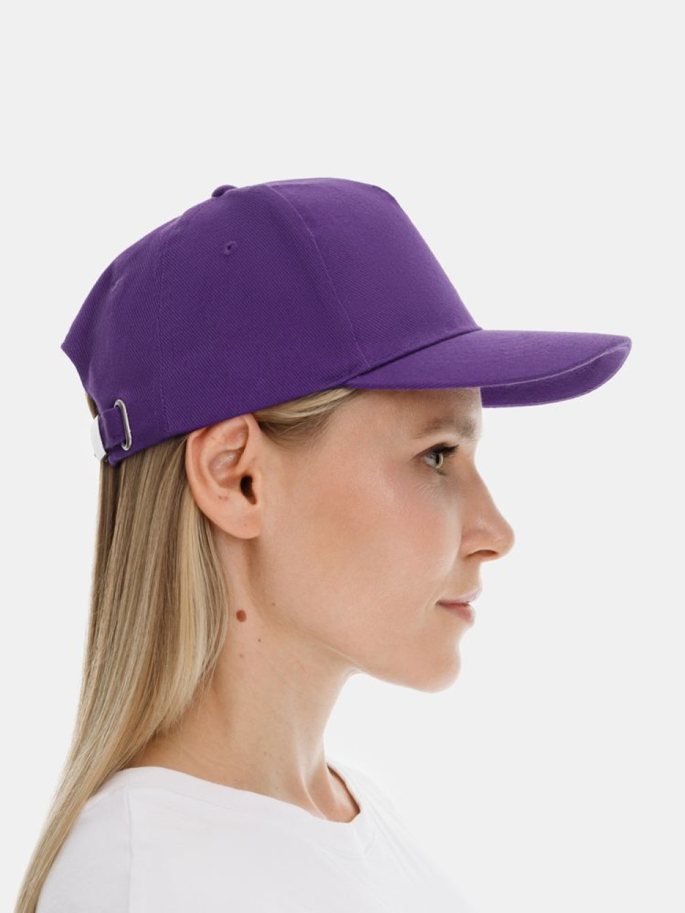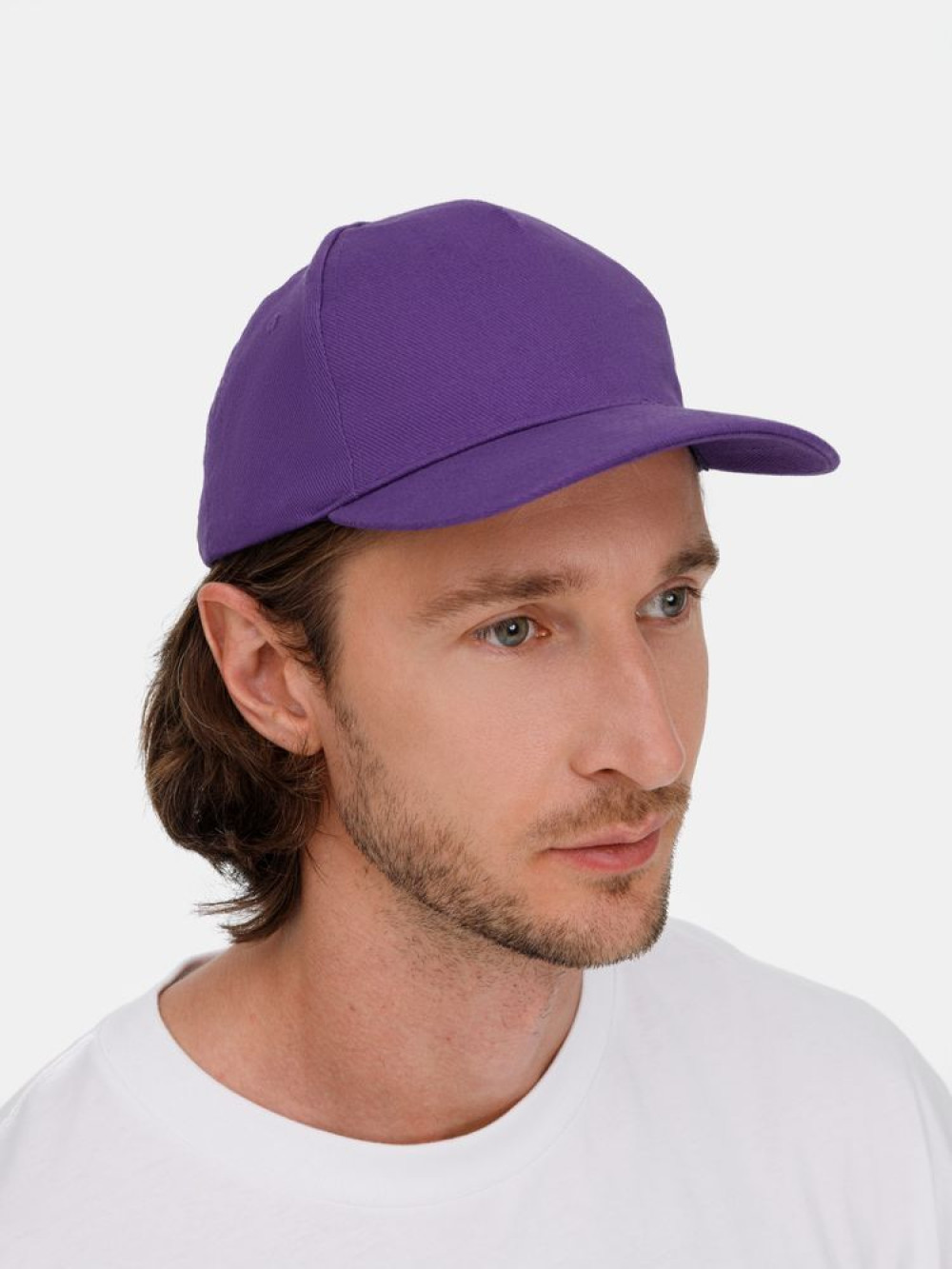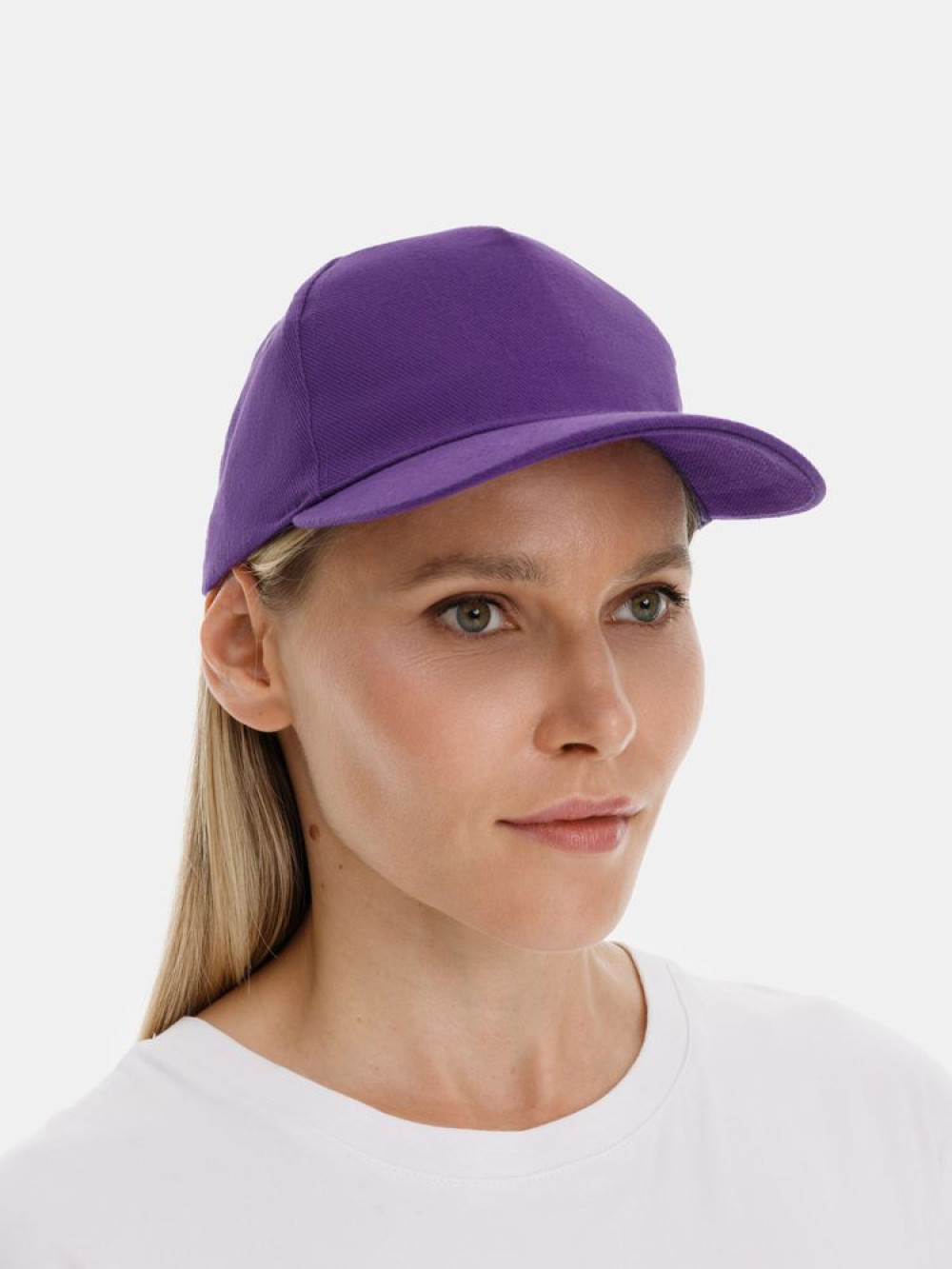 Модель бейсболки с 5-ю клиньями без лобового шва из плотного чесаного хлопка.