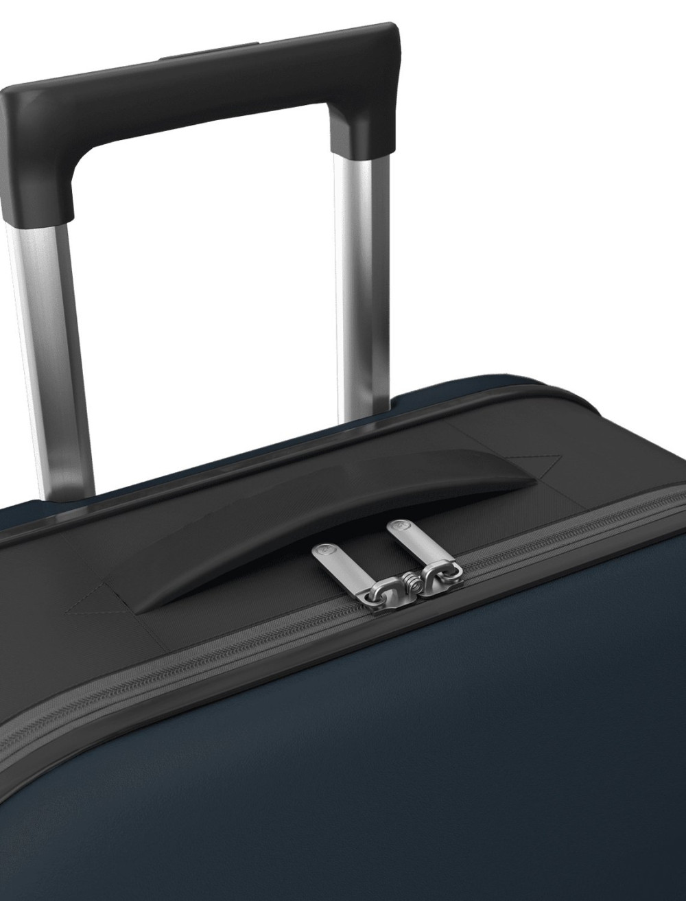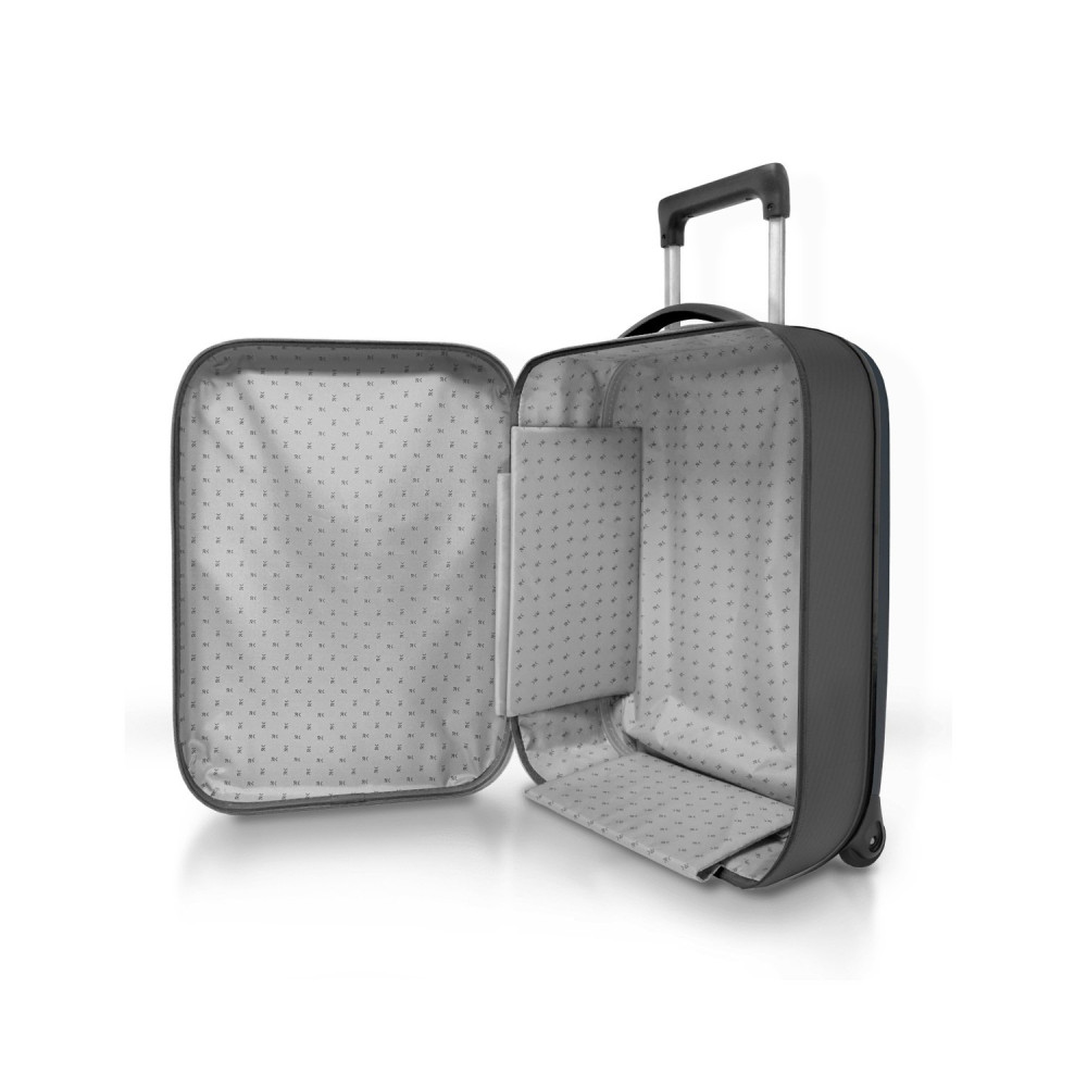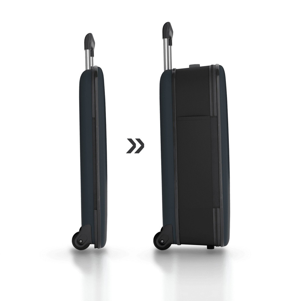 Складной легкий чемодан Rollink Vega II серо-синего цвета Atlantic Blue. Размер 55х40х20 см. В сложенном виде толщина составляет 5 см, с колёсами 8,5 см. Объем 40 л. Вес 2,4 кг. Жесткие стенки сделаны из поликарбоната повышенной ударопрочности. Бока мягкие, из темно-серого плотного полиэстера с высокой водоотталкивающей способностью. Чемодан уверенно стоит вертикально даже в сложенном состоянии. Внутри три откидывающихся жестких клапана на дне и боках чемодана, крепятся липучками и сохраняют форму чемодана в собранном виде. Эластичная Х-образная стяжка для фиксации предметов внутри чемодана. Боковой easy access карман 12х18,5 см на липучке для документов и телефона. Удлиненная надежная выдвижная телескопическая ручка из алюминия с несколькими уровнями фиксации высоты ручки (от пола 88/96/104 см) для людей разного роста и удобная мягкая ручка сверху чемодана, чтобы было удобно нести его в руках. 2 колеса со специальным покрытием и подшипниками для более плавного и бесшумного передвижения. Высококачественная молния черного цвета. В комплект входит эластичная стяжка для фиксации чемодана в сложенном состоянии. Технические характеристики: Колеса рассчитаны на 32 км Чемодан не разбивается при падении с высоты 90 см Стенки из поликарбоната выдерживают удар 32 кг Телескопическая алюминиевая ручка рассчитана на 300 выдвижений Мягкая ручка рассчитана на 500 поднятий Молния рассчитана на 5000 открываний