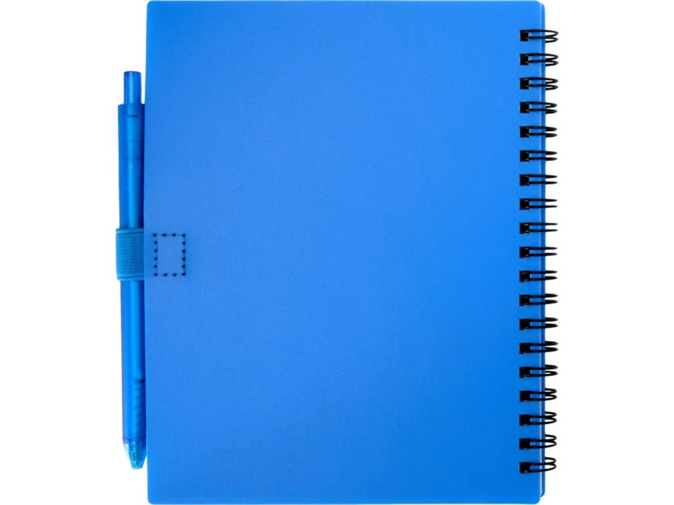 Блокнот Niove с мягкой обложкой изготовлен из переработанной пластмассы, имеет 70 нелинованных листов из бумаги плотностью 70 г/м². Блокнот имеет квадратные углы и петлю для ручки. Размер блокнота: 140 х 178 мм. Шариковая ручка также изготовлена из переработанной пластмассы. Цвет чернил: синий. Длина непрерывной линии: 1000 метров. Диаметр пишущего узла: 1,0 мм.