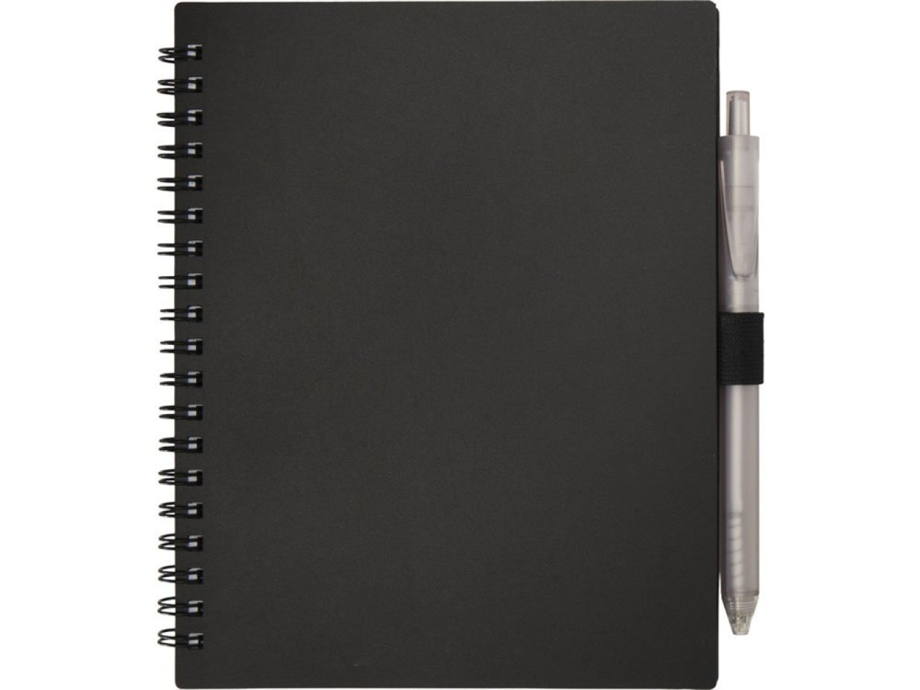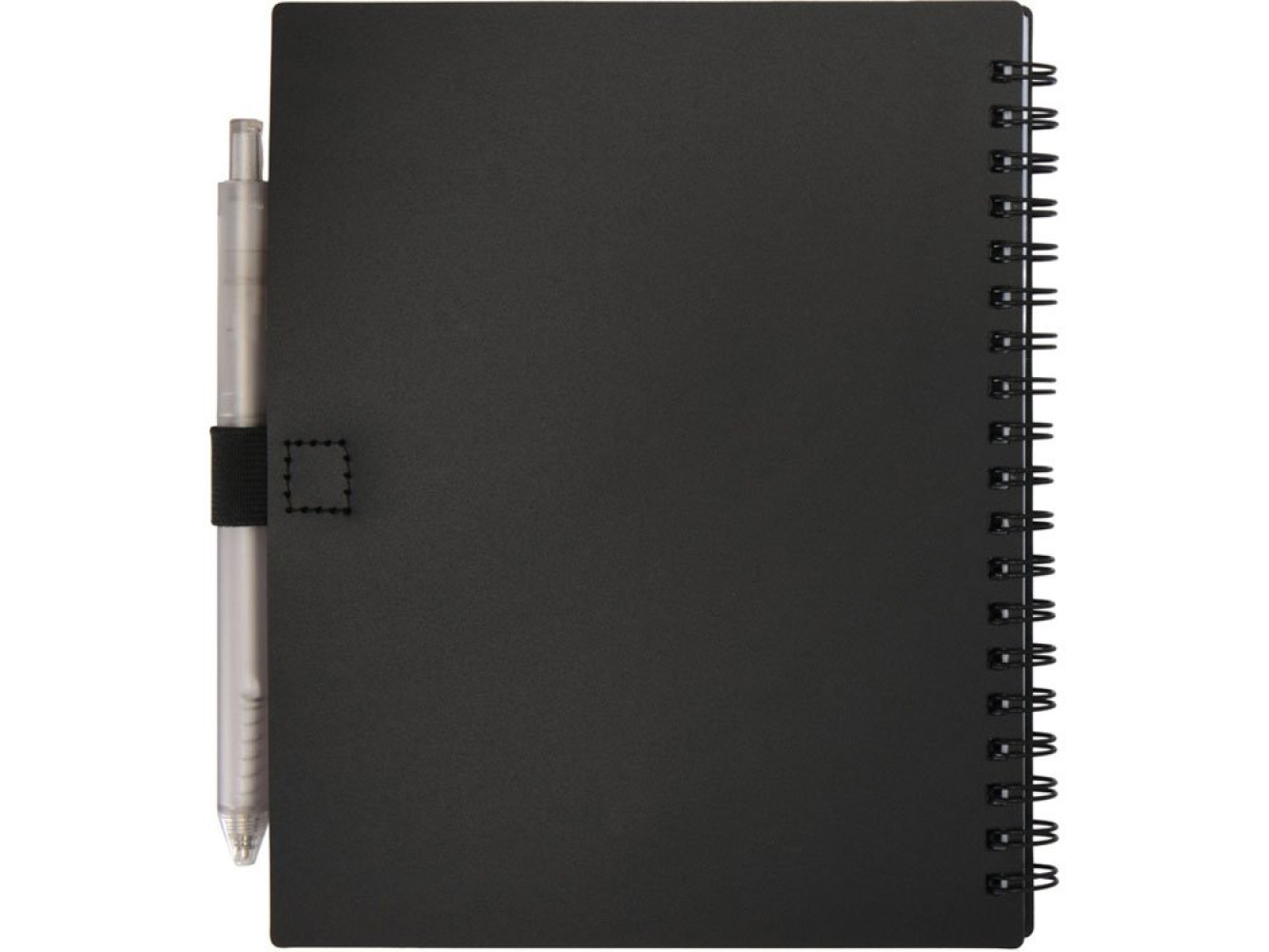 Блокнот Niove с мягкой обложкой изготовлен из переработанной пластмассы, имеет 70 нелинованных листов из бумаги плотностью 70 г/м². Блокнот имеет квадратные углы и петлю для ручки. Размер блокнота: 140 х 178 мм. Шариковая ручка также изготовлена из переработанной пластмассы. Цвет чернил: синий. Длина непрерывной линии: 1000 метров. Диаметр пишущего узла: 1,0 мм.