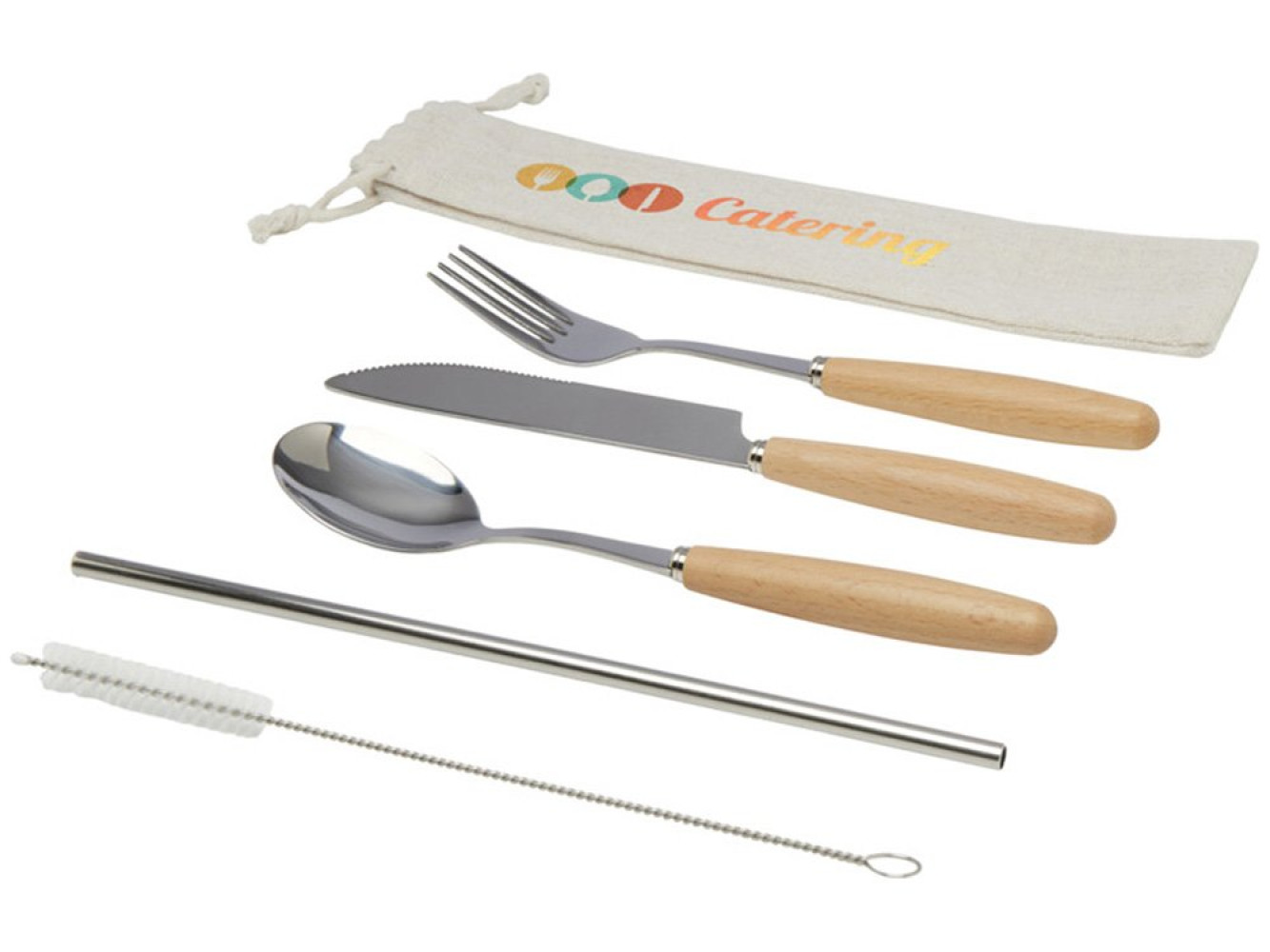 вилка, нож, ложка, многоразовая соломинка и щеточка для её чистки.