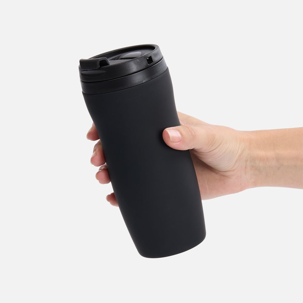 Двухслойная конструкция из нержавеющей стали снаружи и пищевого пластика внутри. Герметичная завинчивающаяся крышка с откидным клапаном для питья. Покрытие софт-тач. В отверстие в крышке можно вставить шнурок для удобного ношения стакана на руке. Шнурок в комплект не входит.