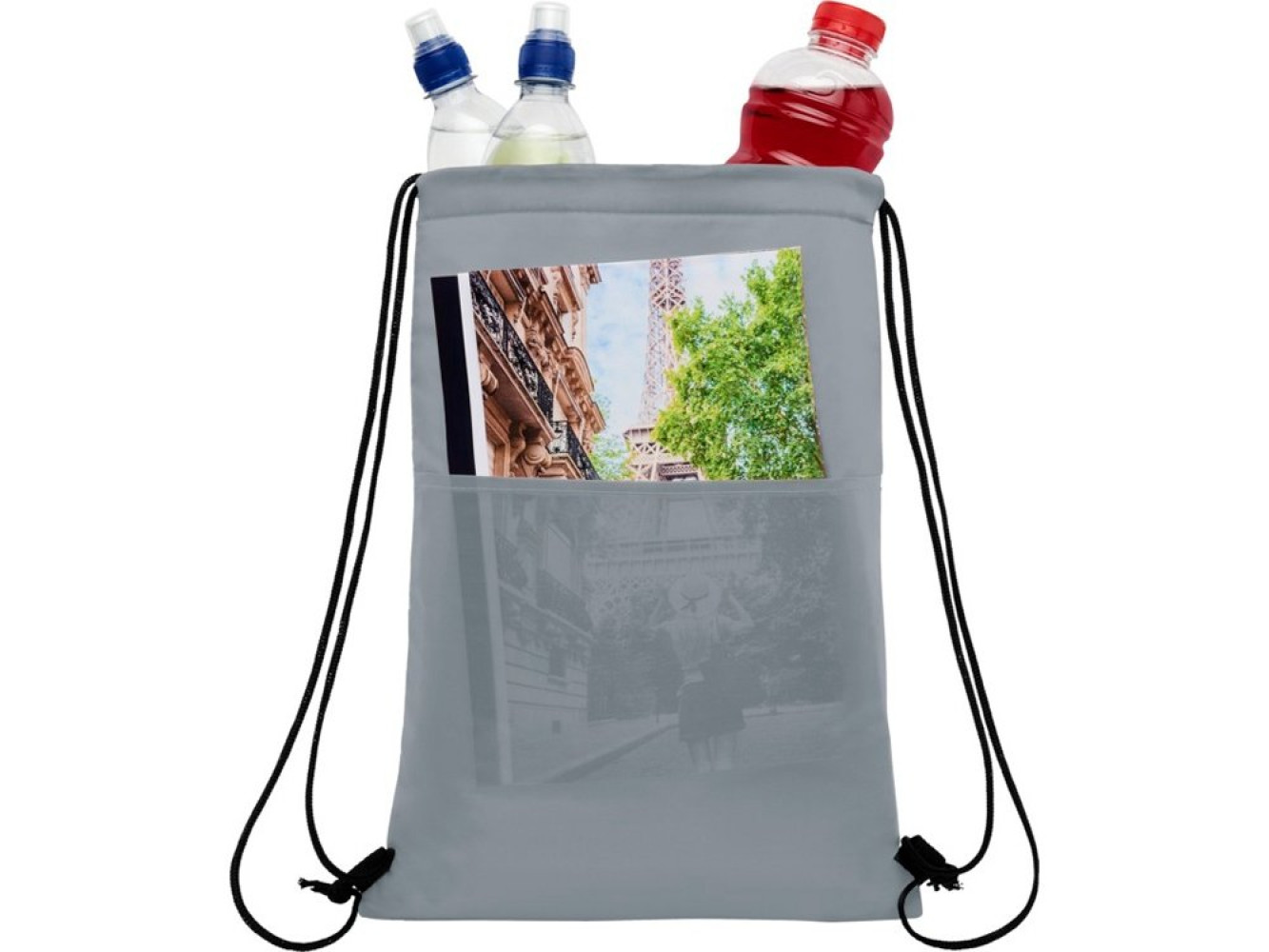 Сумка-холодильник затягивается на шнурок черного цвета. С открытым передним карманом. Вмещает 12 банок. Прочность до 5 кг.