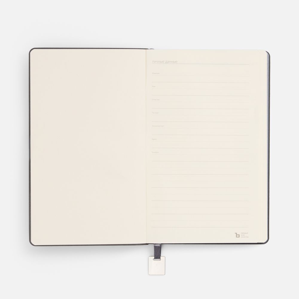 дополнен ляссе в цвет обложки с металлическим шильдиком.