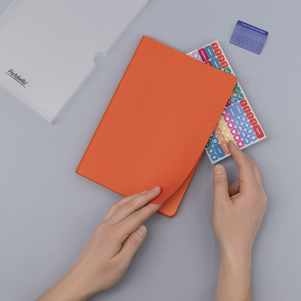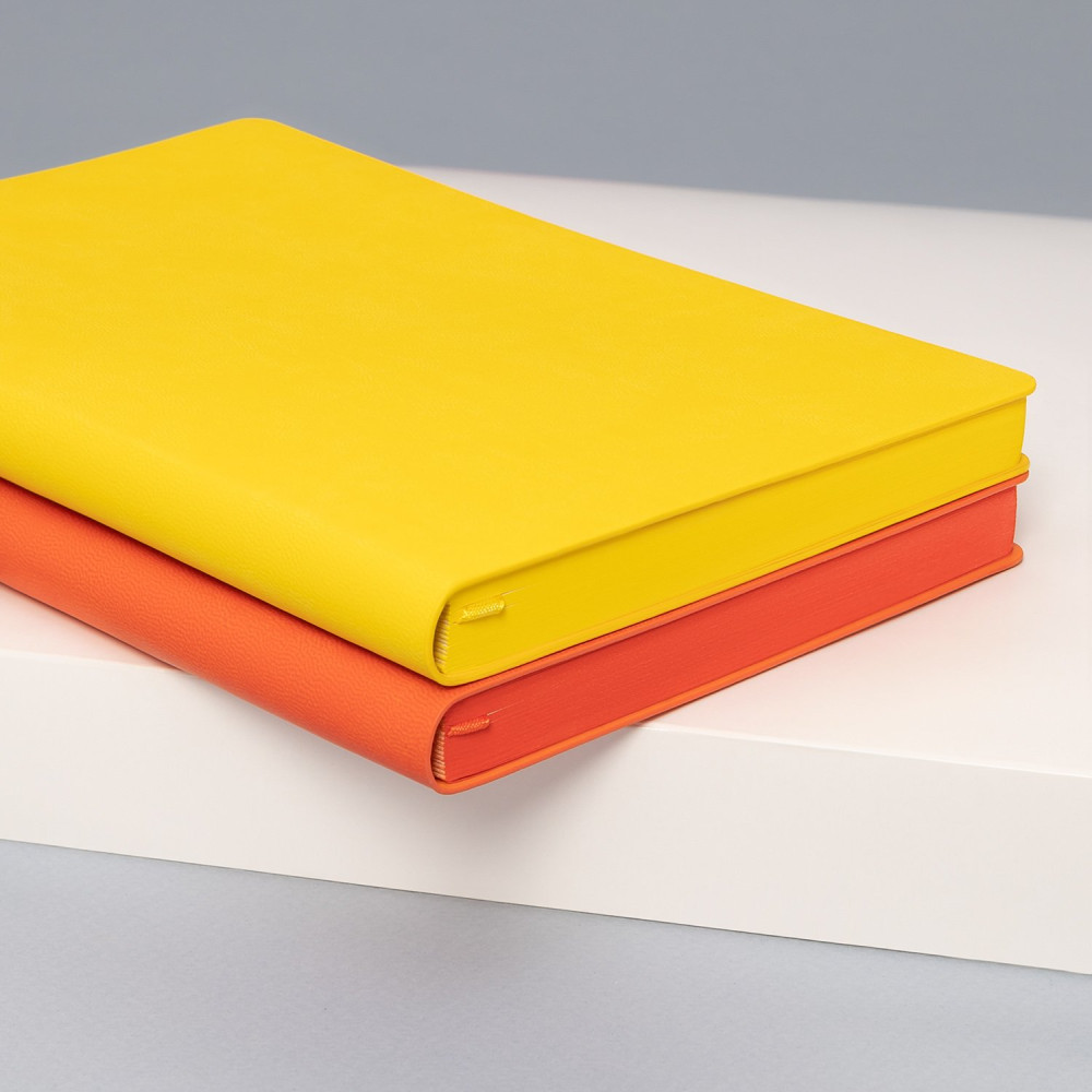 обложкой спрятан теплый кремовый бумажный блок с яркими форзацем,