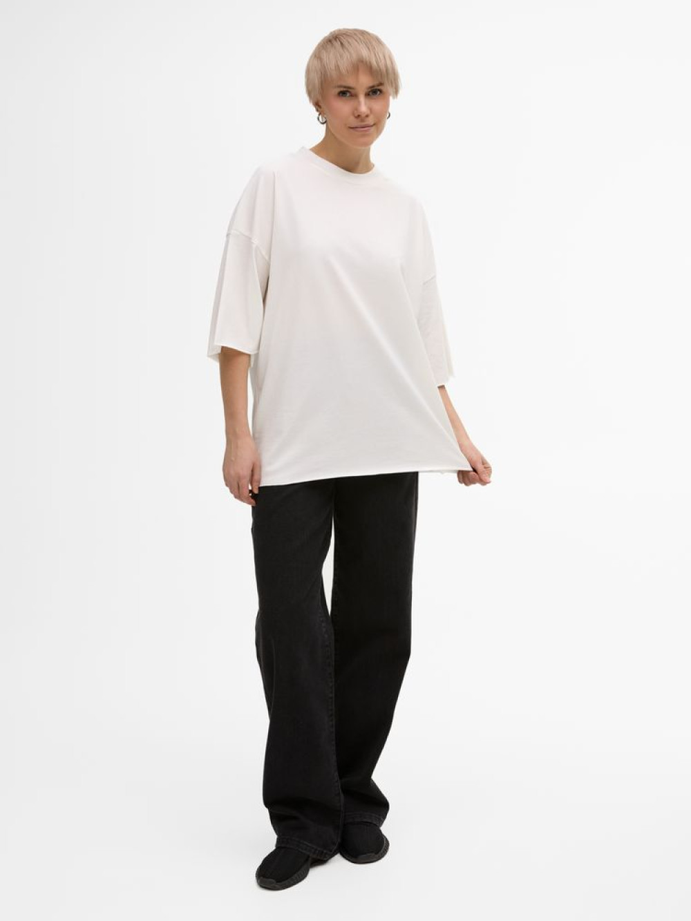 Футболка унисекс свободного кроя со спущенным плечом.