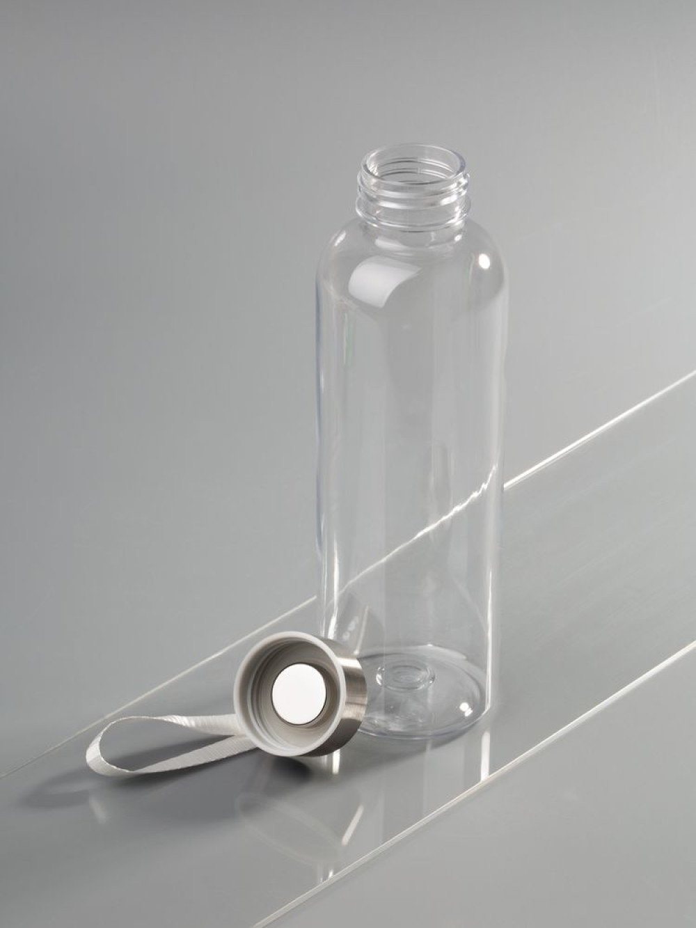 Бутылка для воды классической формы с удобной петлей для переноски и широкими возможностями по нанесению: помимо круговой УФ-печати доступны гравировка крышки или полноцветный трансфер на ремешке.