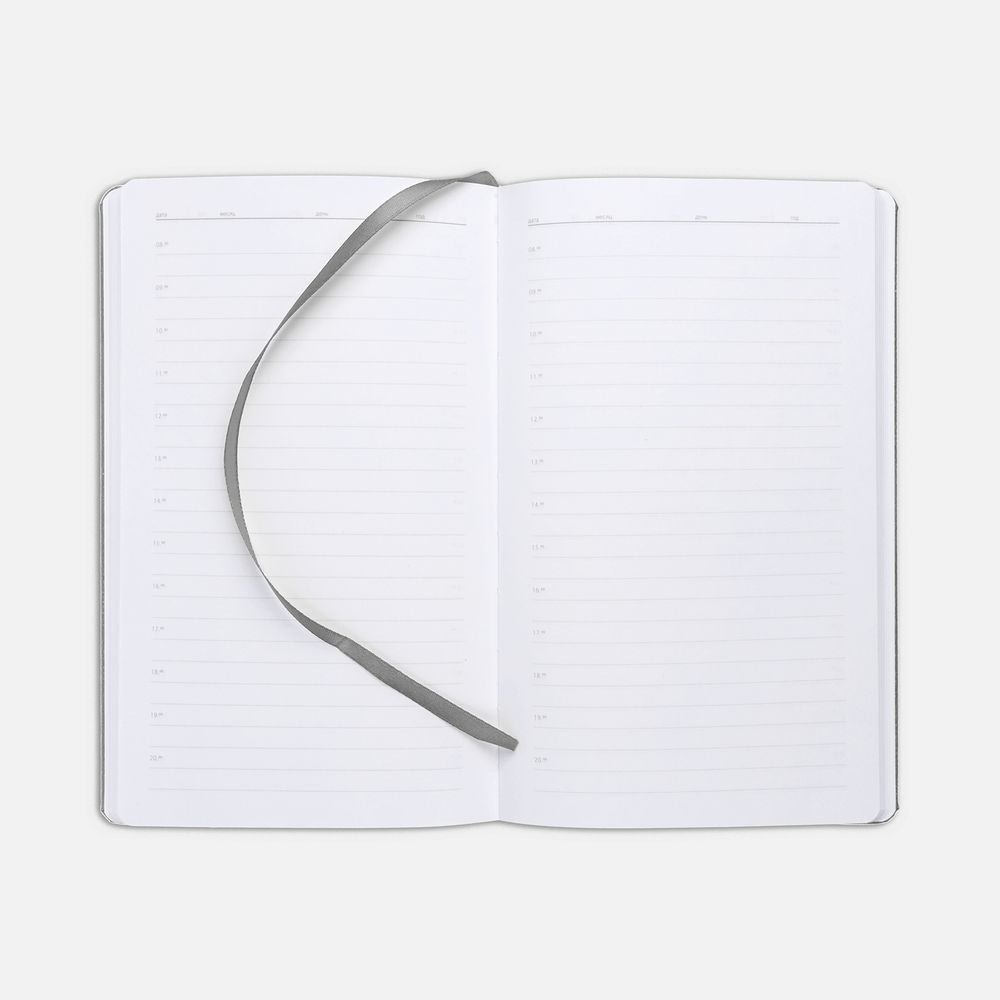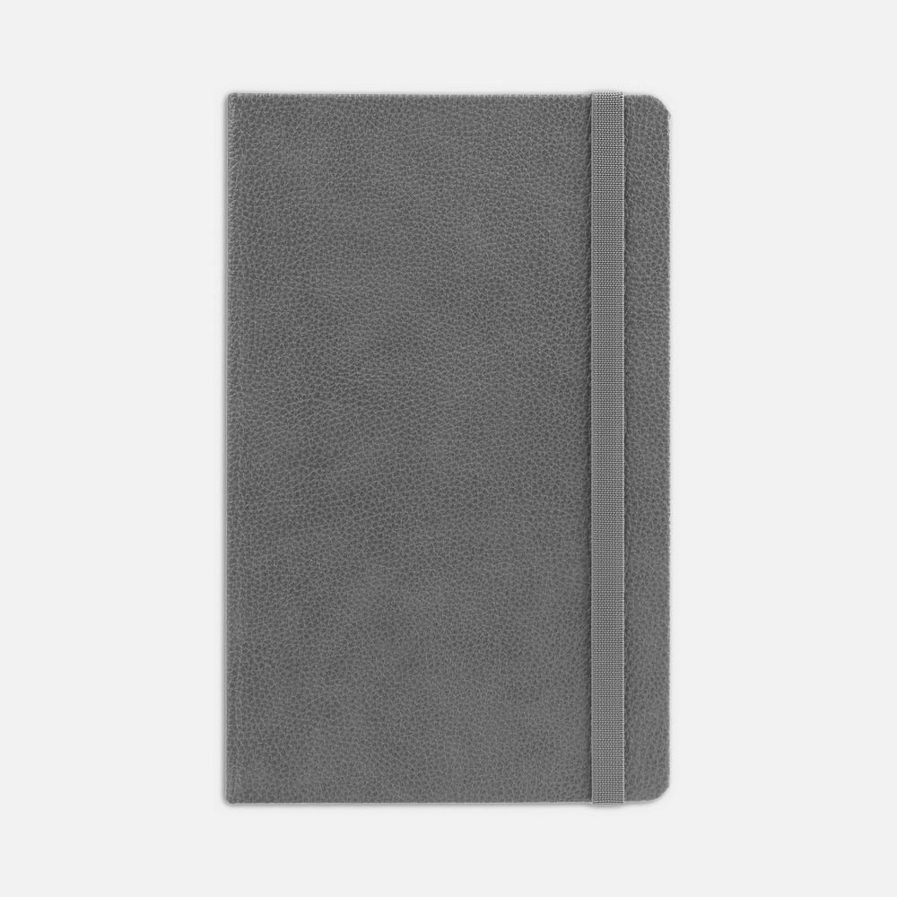 Ежедневник с твердой обложкой, выполнен из материала LaFite, серый СС, дополнен резинкой и ляссе в цвет обложки.