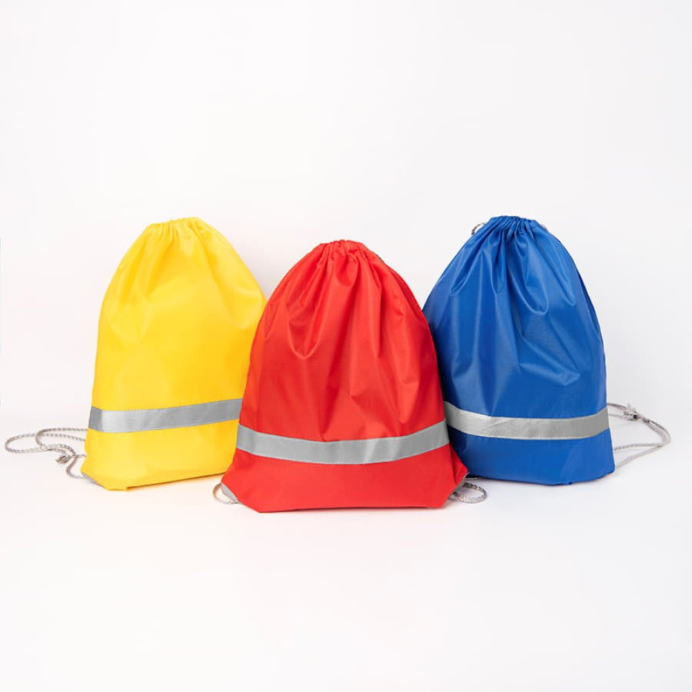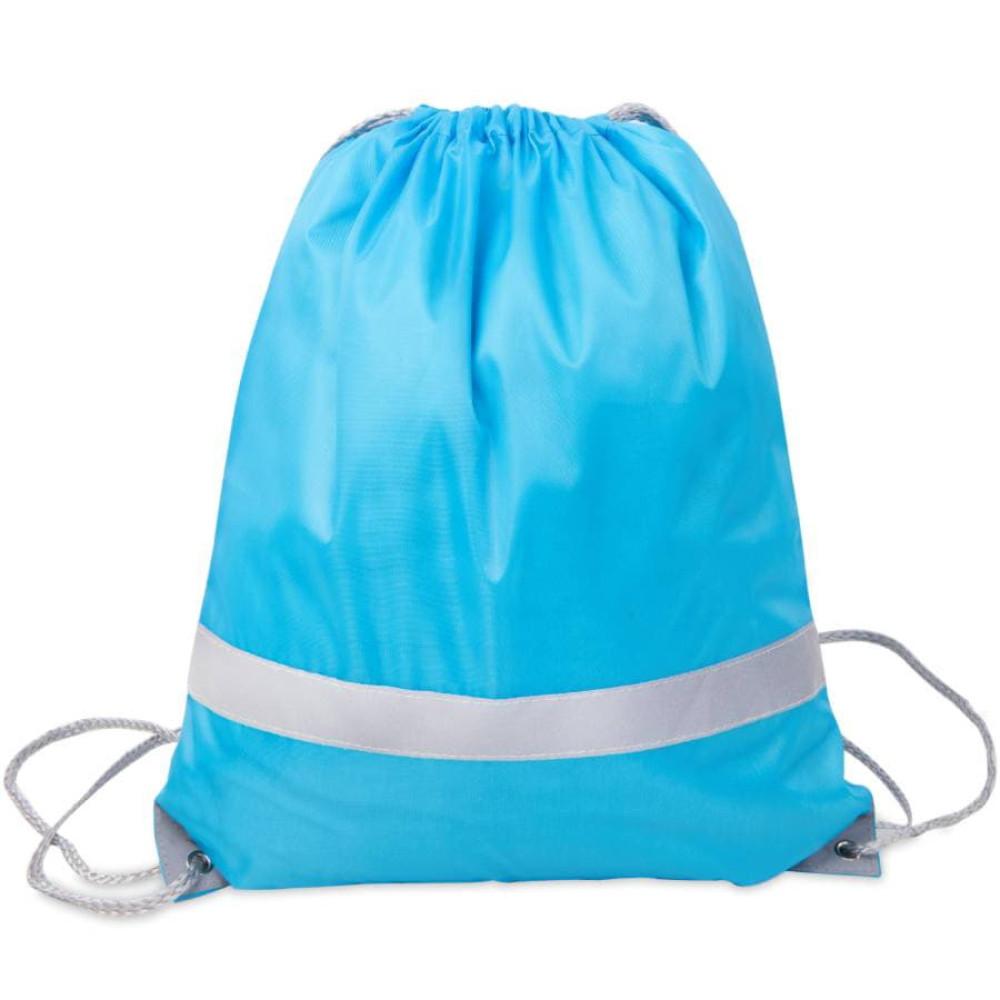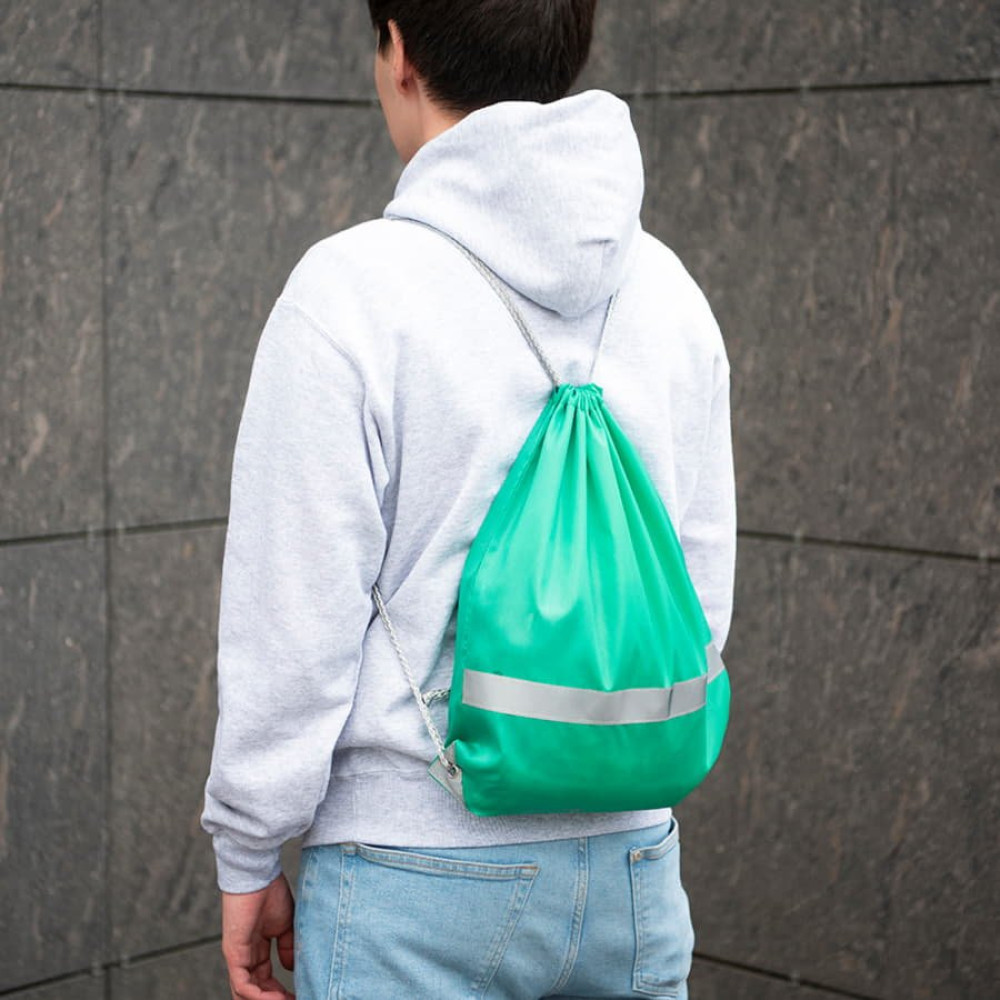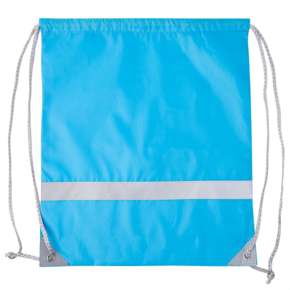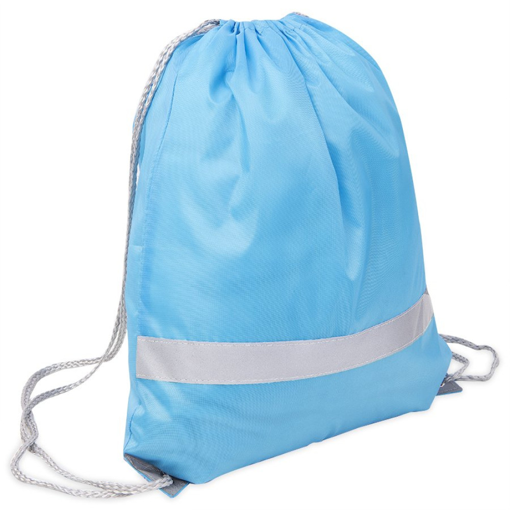 Рюкзак-мешок RAY из полиэстера 210Dсо светоотражающей полосой спереди, светоотражающими уголками,усиленными металлическими люверсамиЛегко и просто затягивается по верхней части серыми шнурами.