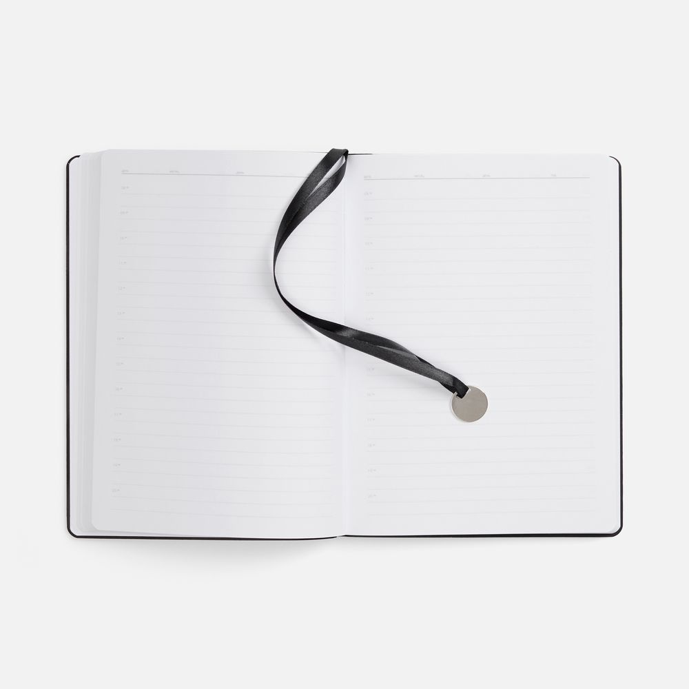 Ежедневник с гибкой обложкой, выполнен из материала La Fite, черный АА, дополнен ляссе в цвет обложки с металлическим шильдом.
