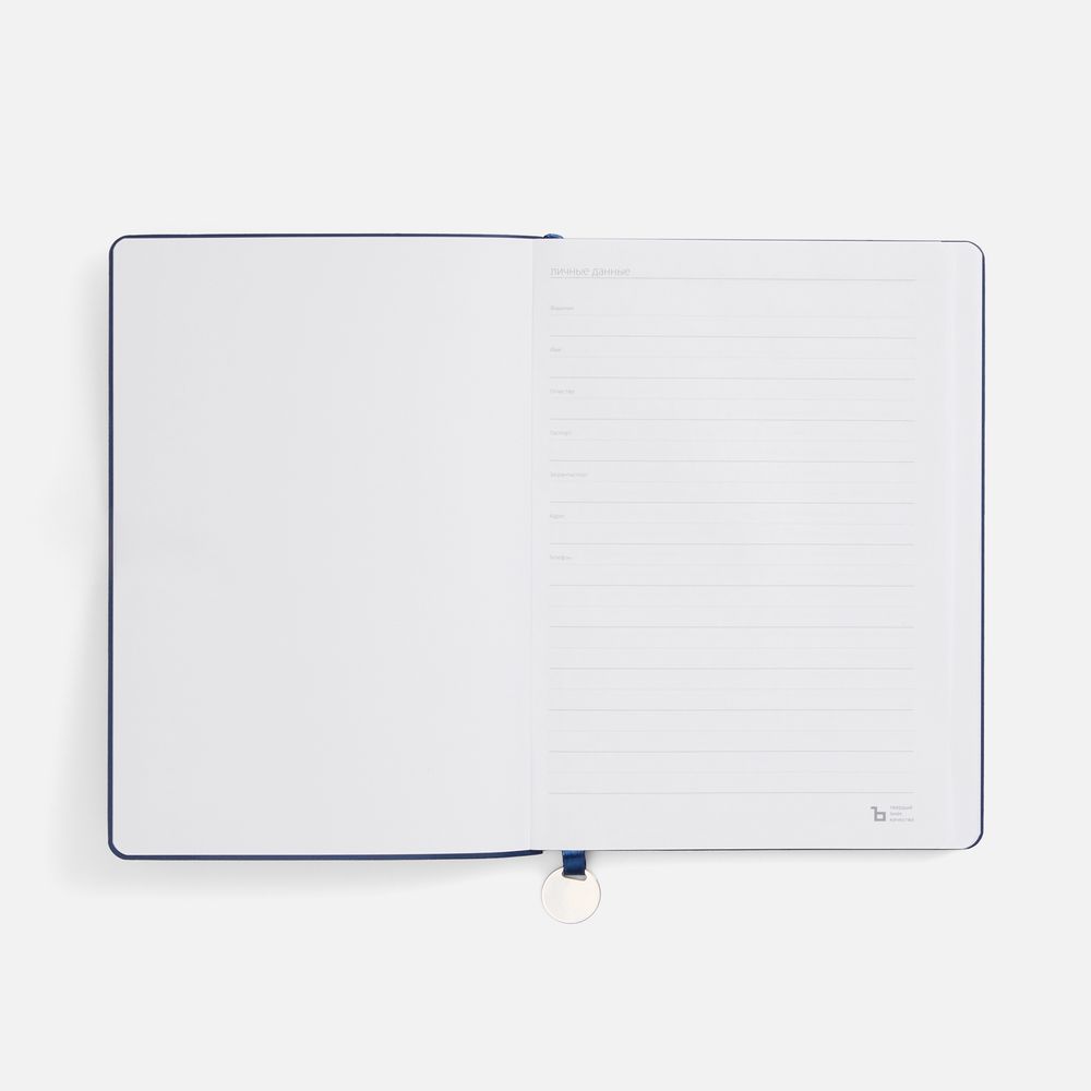 Ежедневник с гибкой обложкой, выполнен из материал La Fite, темно-синий ХХ, дополнен ляссе в цвет обложки с металлическим шильдом.