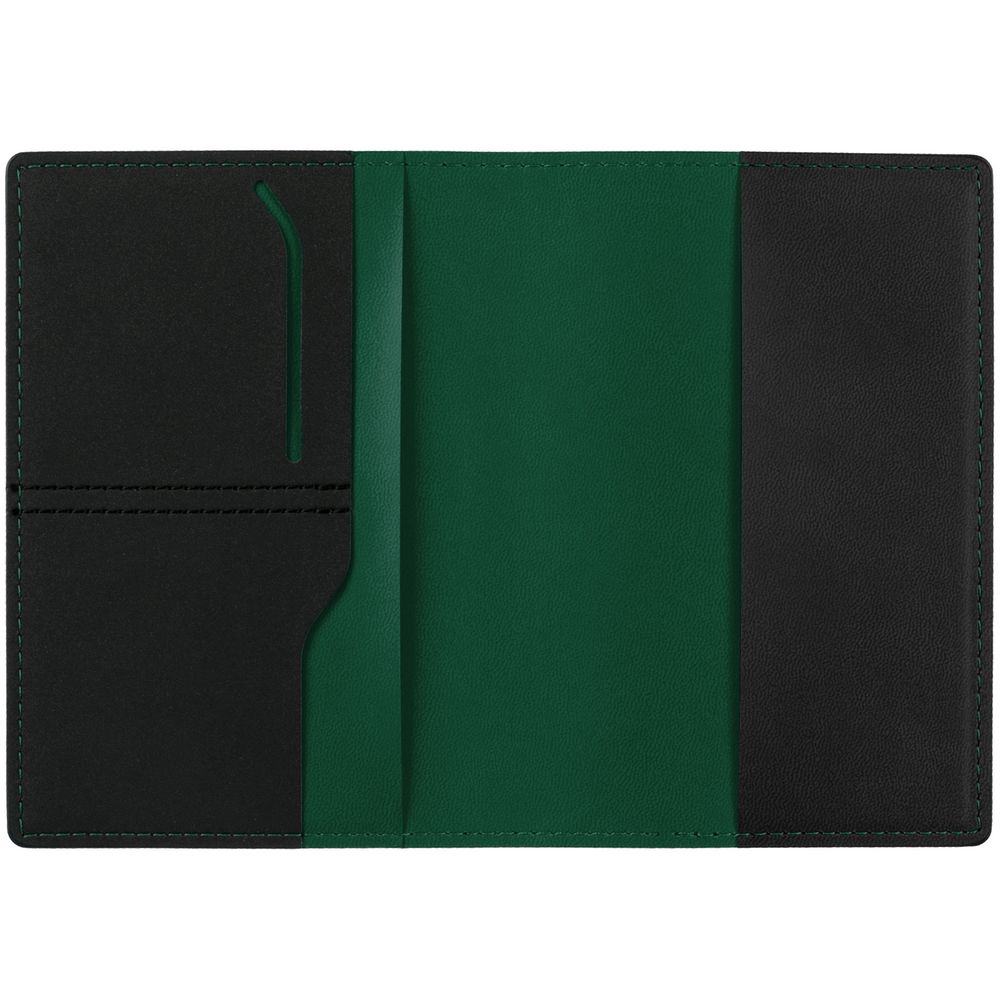 Имеет основное отделение для паспорта и 2 отделения для визиток или