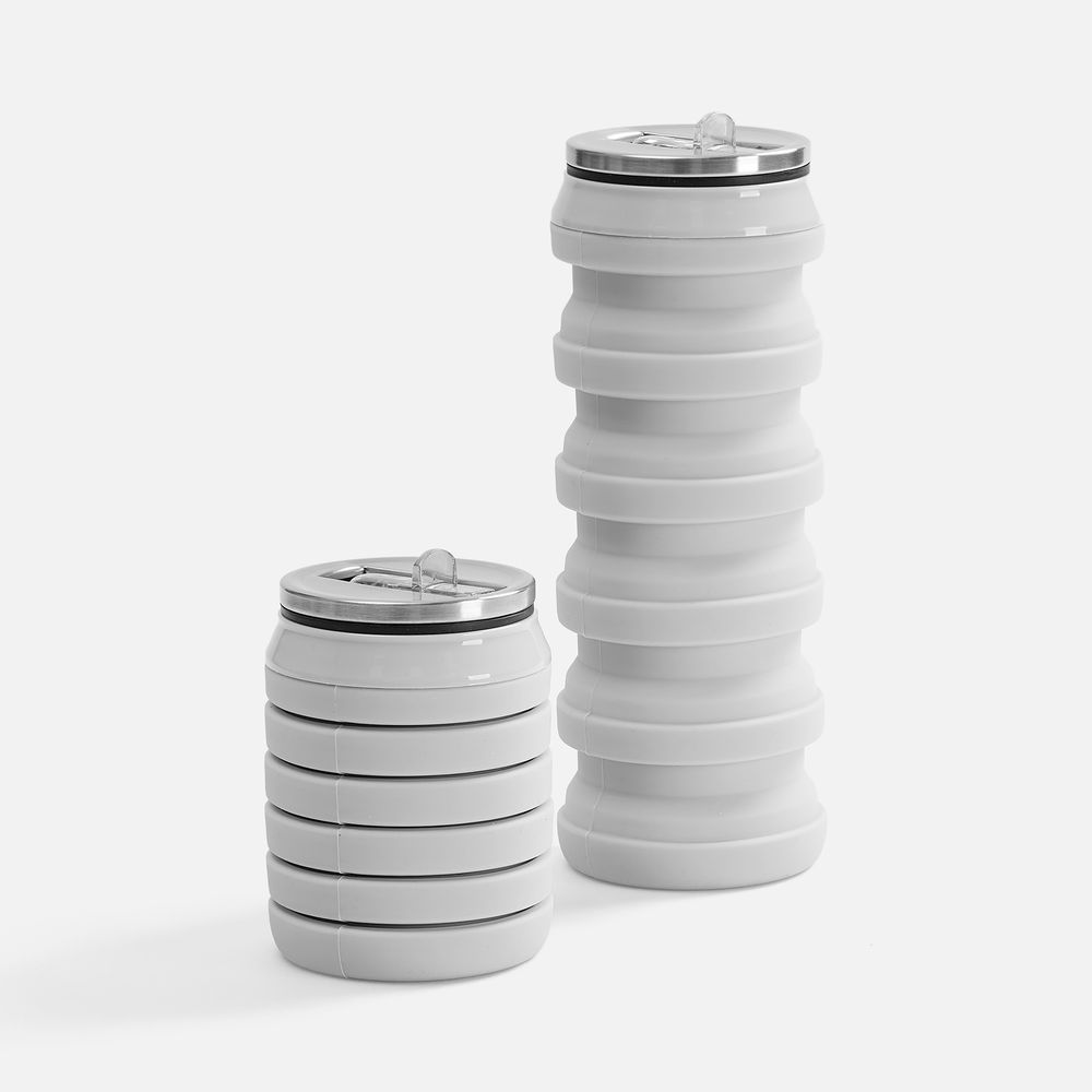 Складная бутылка для воды Folla привлекает внимание своим необычным внешним видом и функциональностью. По форме она больше всего напоминает классическую алюминиевую банку для напитков. При этом ее высоту можно легко увеличить с 10 до 20 см. В сложенном виде бутылка поместится даже в небольшую сумочку, а полный полезный объем составляет целых 480 мл.