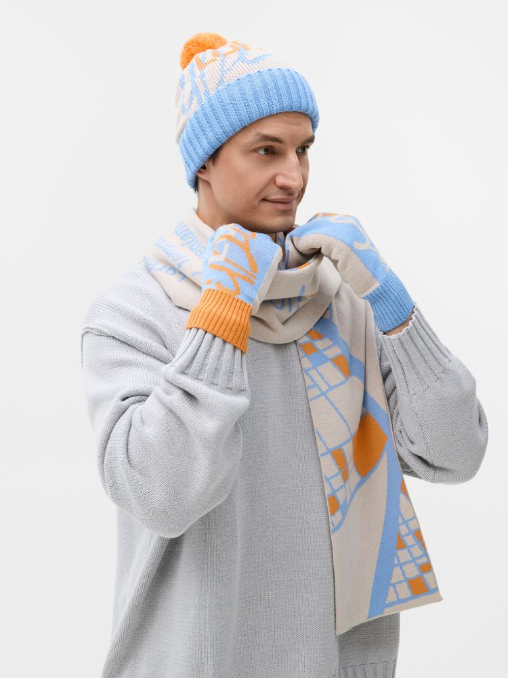 Варежки с вывязанным логотипом и индивидуальным рисунком в фирменной цветовой гамме.