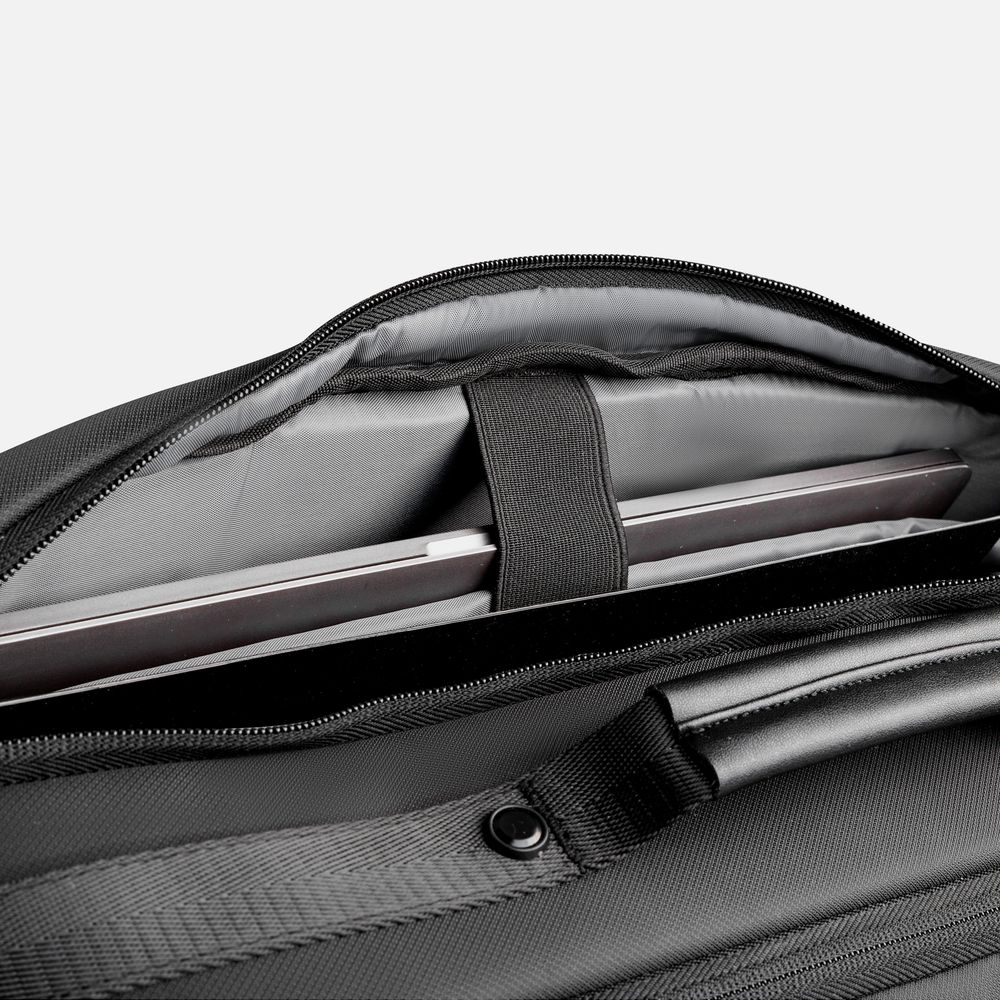 • Два отделения на молнии: первое — для документов с усиленным карманом под ноутбук, второе — объемное отделение для вещей с панелью‑органайзером и внутренним карманом на молнии
