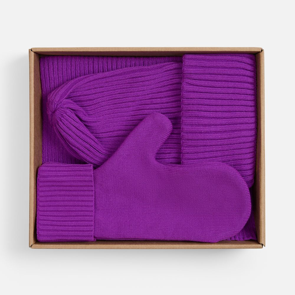 В набор входит удобный шарф с технологичным отверстием для быстрого завязывания, шапка с двойным отворотом и теплые двухслойные варежки с широкой манжетой. Все изделия связаны из акриловой пряжи, отличаются практичностью и элегантной простотой.