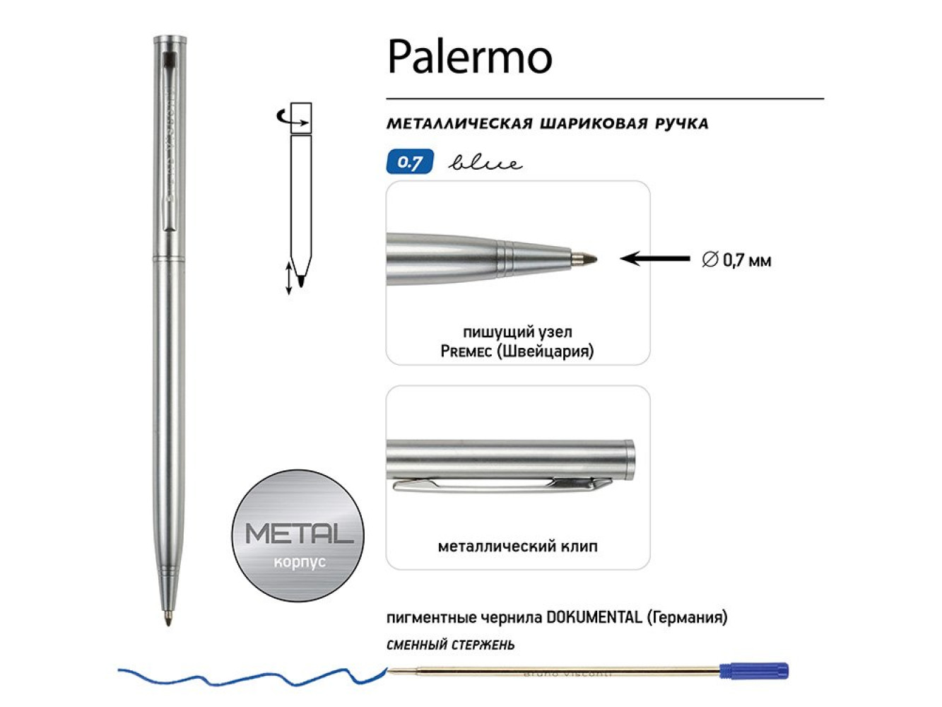 Автоматическая металлическая ручка "Bruno Visconti" серии "Palermo" однотонного цвета порадует любителей всего изящного и утонченного. Стержень легко выдвигается благодаря поворотному механизму. Синие пигментные чернила Dokumental (Германия) и пишущий узел Premec (Швейцария) обеспечивают качественное и мягкое письмо.