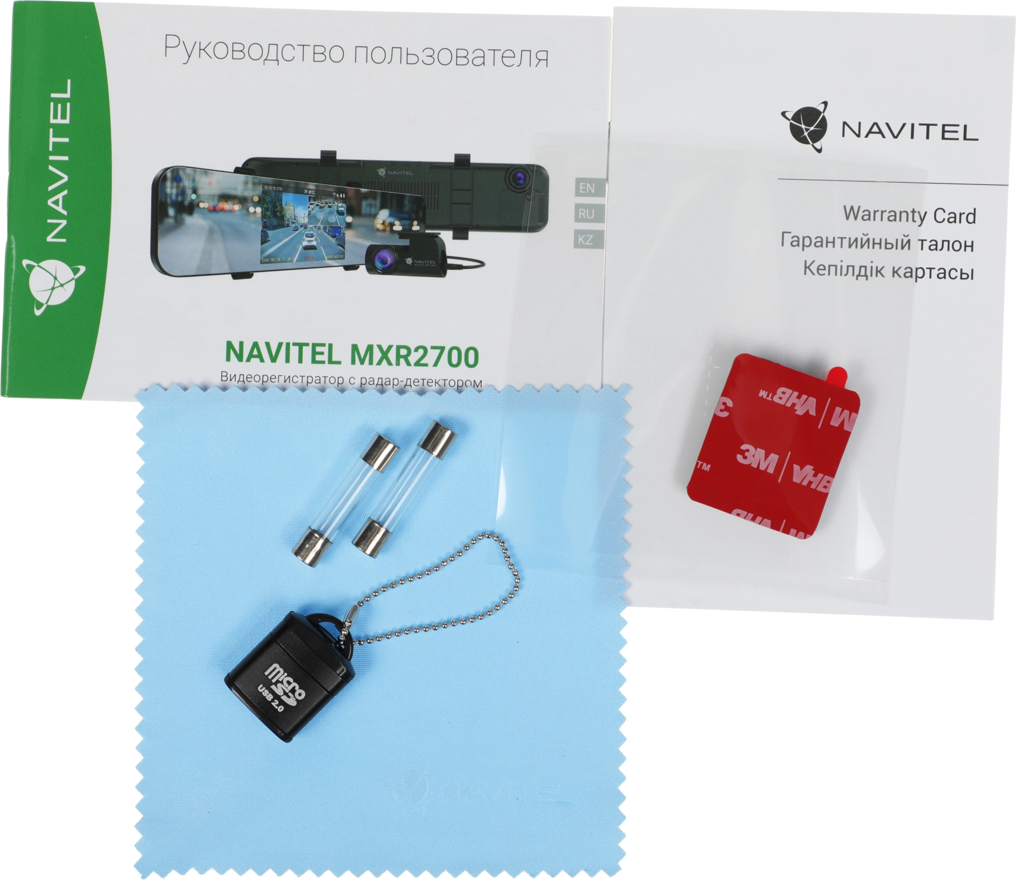 Комплектация:Видеорегистратор NAVITEL MXR2700, электростатическая пленка, автомобильное зарядное устройство 12 В со сквозным питанием, 2 предохранителя, кабель для скрытой установки длиной 400 см., камера заднего вида, кабель для подключения камеры заднего вида, картридер, салфетка из микрофибры, инструкция.