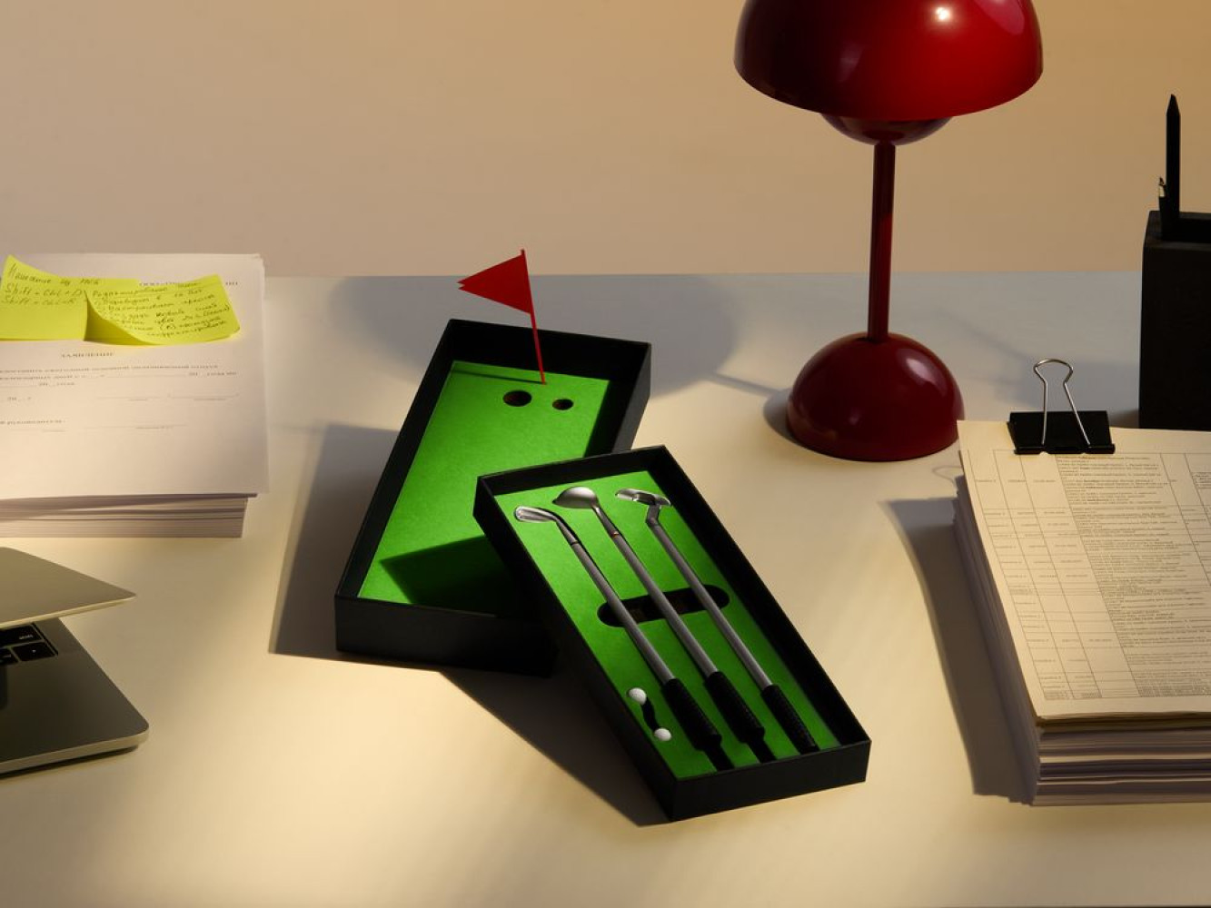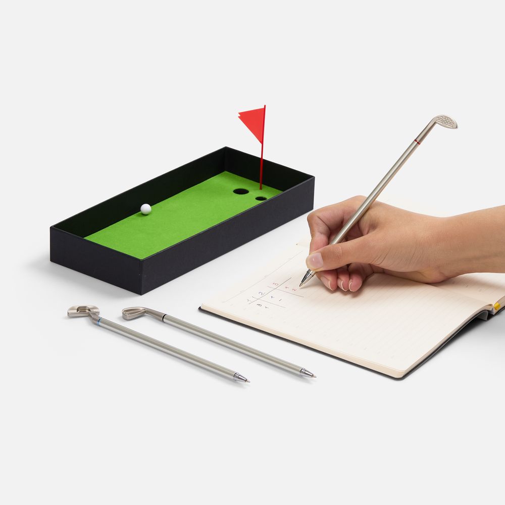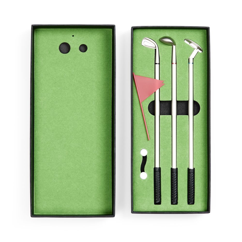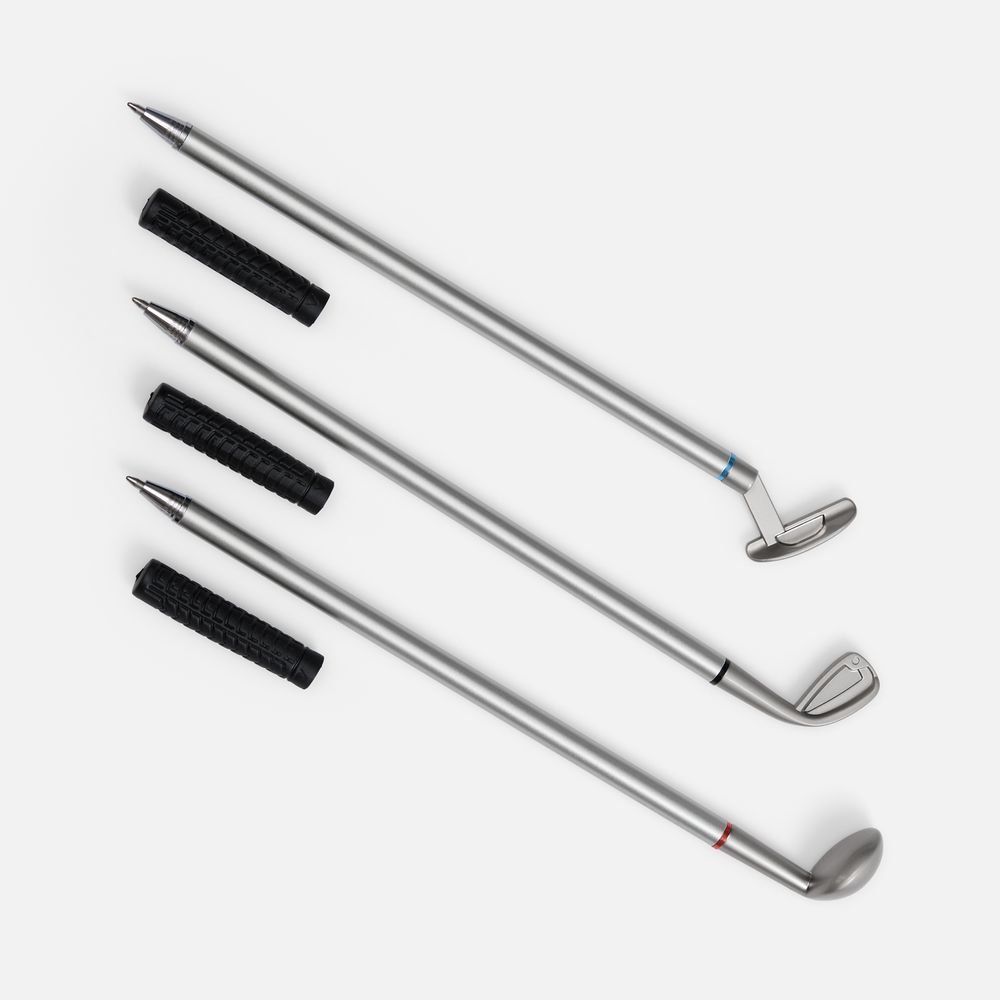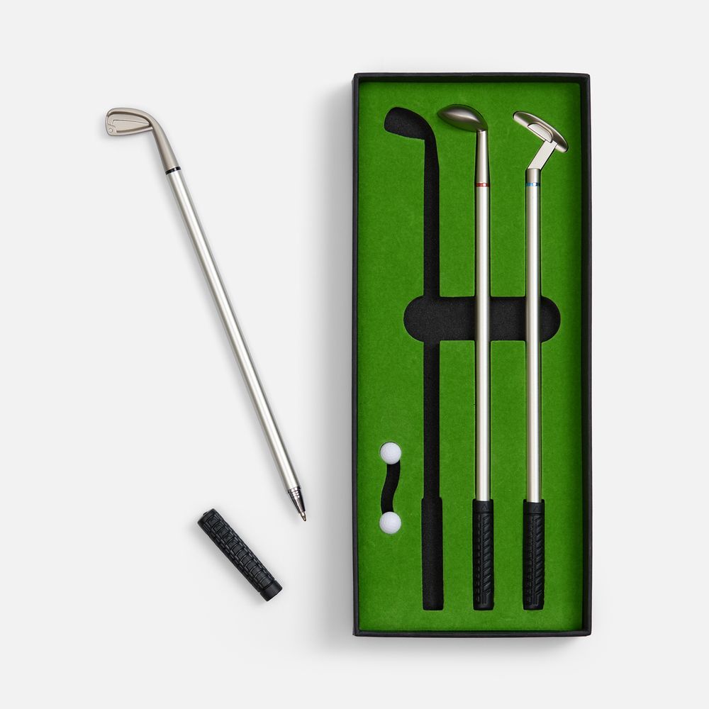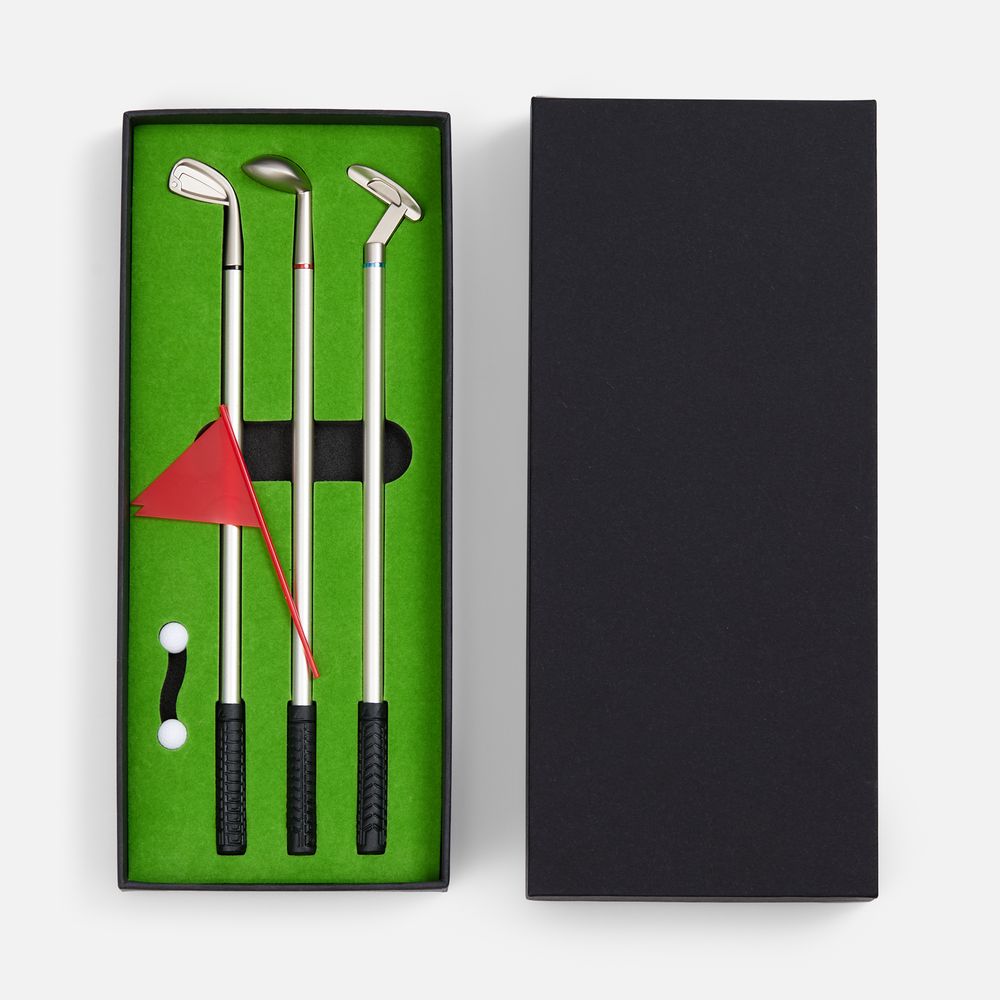 В комплекте: 3 клюшки-ручки со сменным стержнем с синими, черными и красными чернилами, 2 мячика для гольфа, флажок и подарочная коробка.