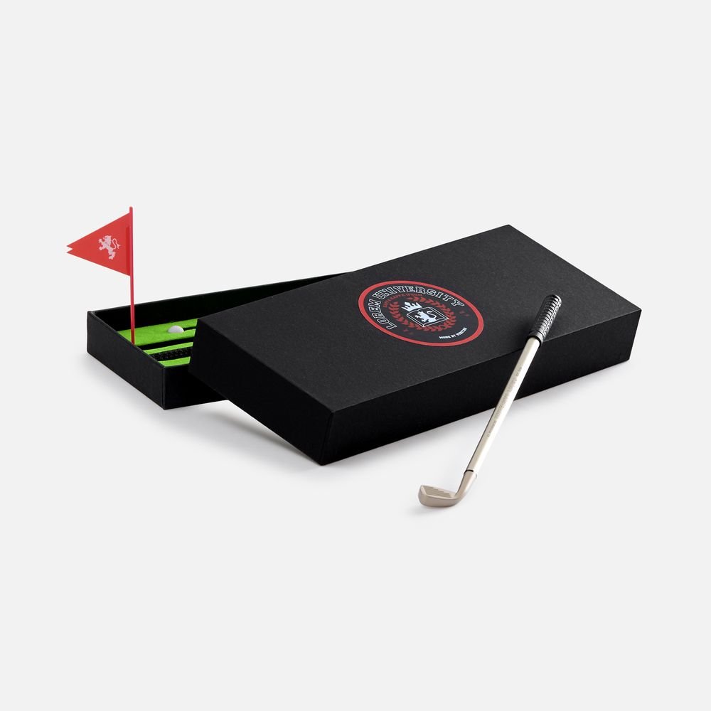 В комплекте: 3 клюшки-ручки со сменным стержнем с синими, черными и красными чернилами, 2 мячика для гольфа, флажок и подарочная коробка.