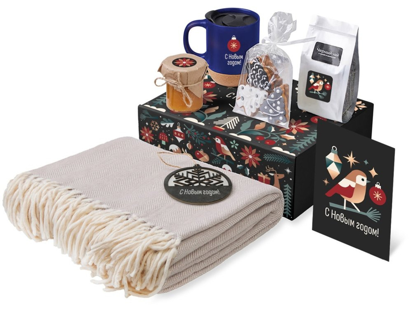 • Материал: плед - 100% хлопок; кружка - керамика, пробка; подвеска - дерево; открытка - бумага