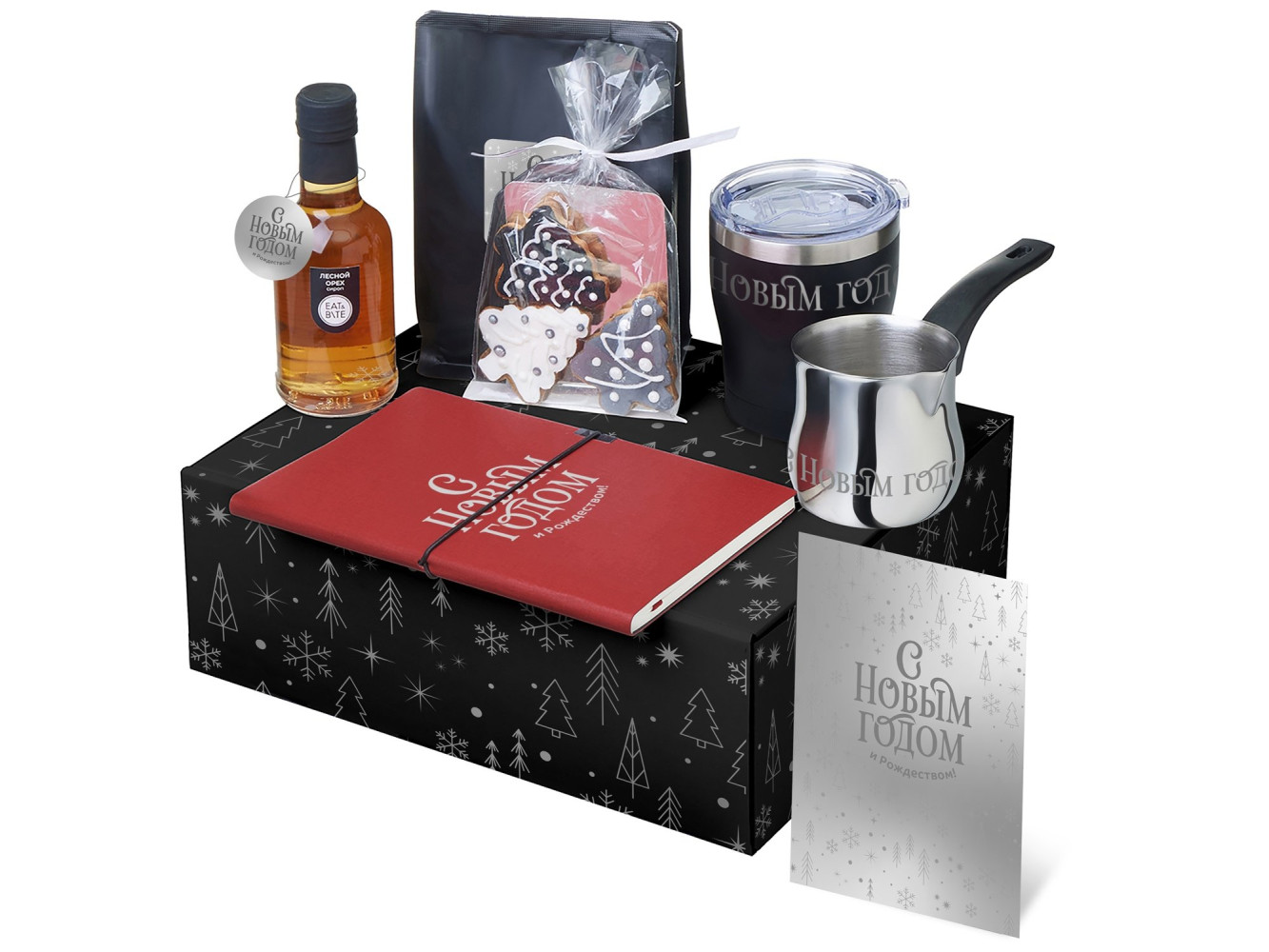 • Материал: блокнот - искусственная кожа, бумага; турка - нержавеющая сталь, ручка - бакелит; термокружка - нержавеющая сталь, керамика, крышка- полипропилен; открытка - бумага; мешок - нетканый материал (спанбонд)