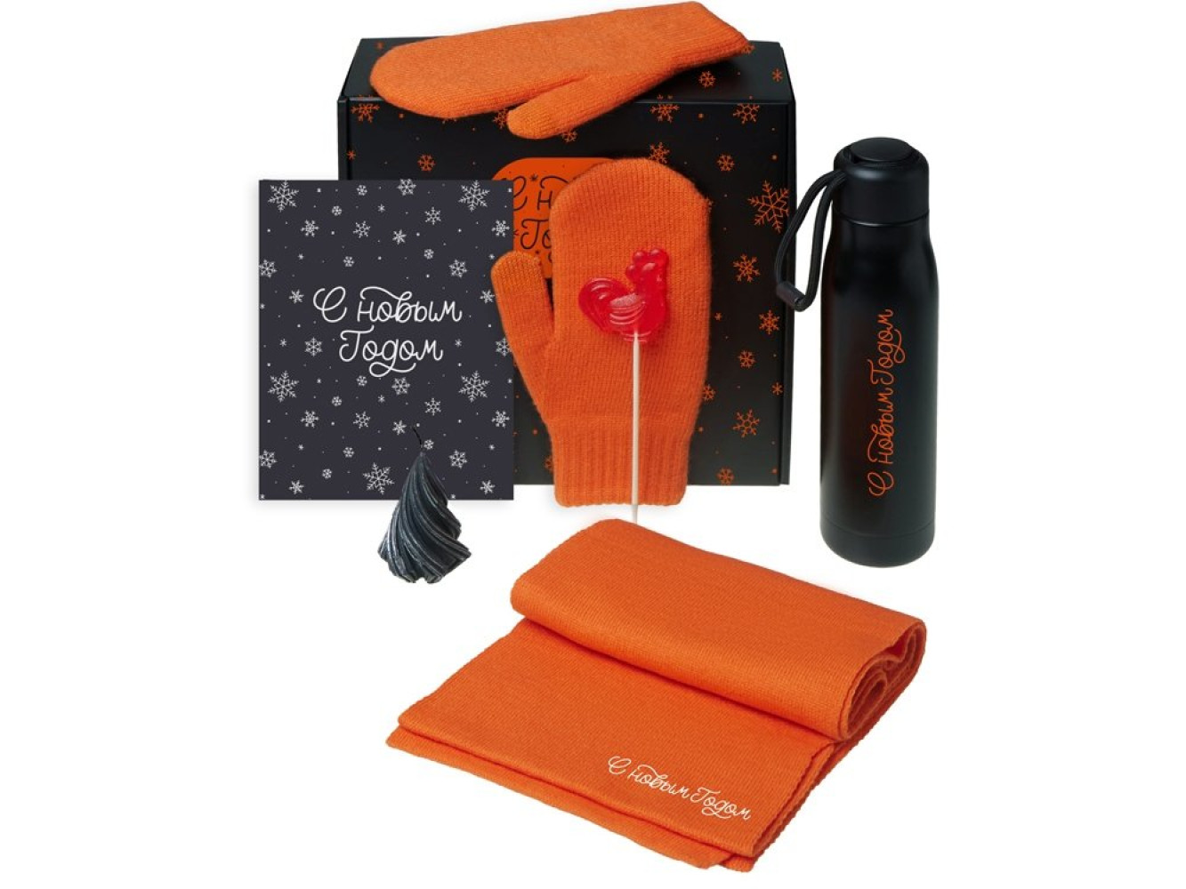 • Материал: варежки - 100% акрил; шарф - 100% акрил; термос - нержавеющая сталь; открытка - бумага; мешок - нетканый материал