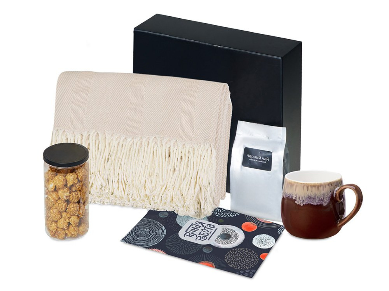• Материал: плед - 100% хлопок, кружка - костяной фарфор с покрытием soft-touch,чай - пластик, попкорн - пластик, металл, мешок - нетканый материал (спандонд), коробка - картон