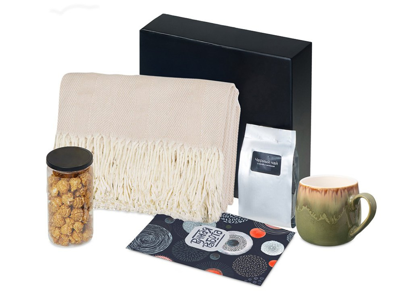 • Материал: плед - 100% хлопок, кружка - костяной фарфор с покрытием soft-touch,чай - пластик, попкорн - пластик, металл, мешок - нетканый материал (спандонд), коробка - картон