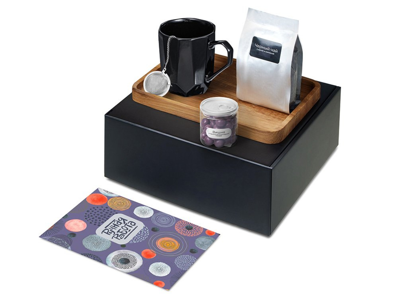 • Материал: кружка - костяной фарфор, чай - пластик, ситечко для чая - нержавеющая сталь, поднос - дуб, мешок - нетканый материал (спанбонд), коробка - картон