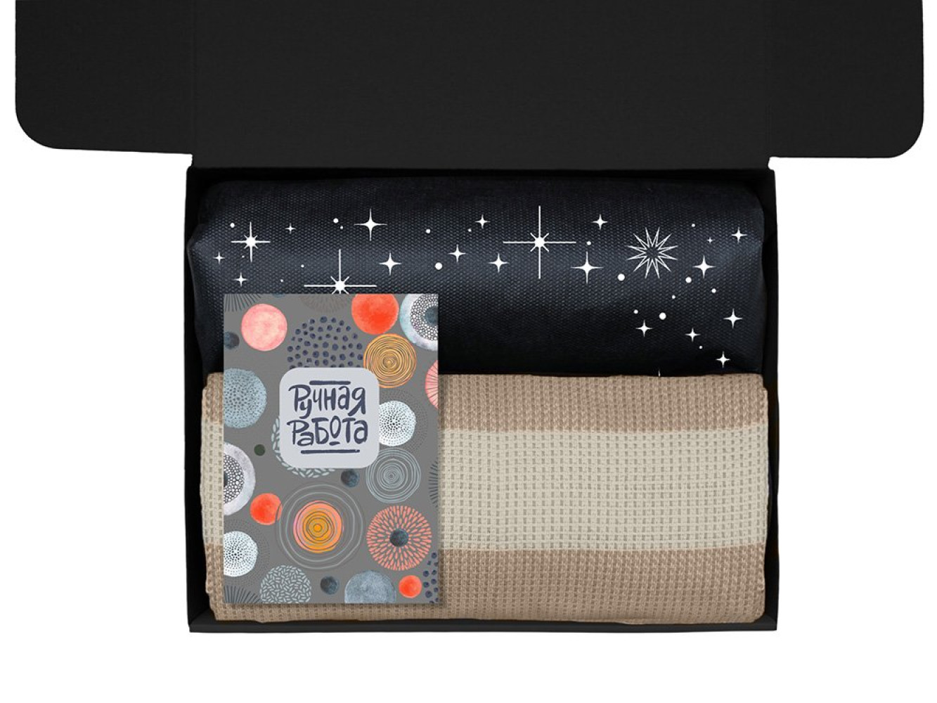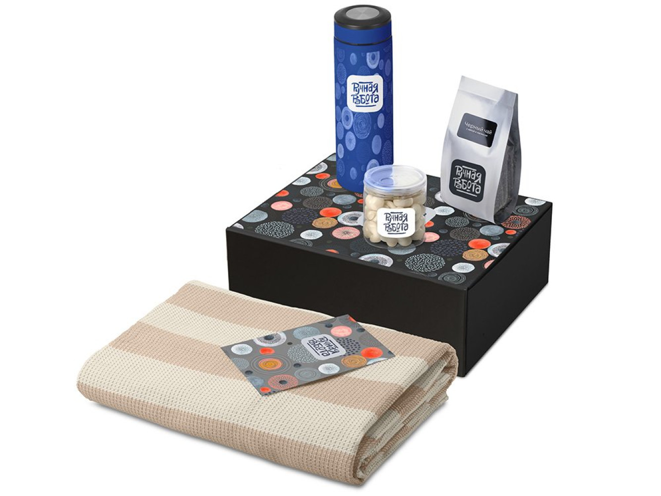 • Материал: плед - 100% хлопок, термос - нержаваеющая сталь с покрытием soft-touch, чай - пластик, мешок - нетканый материал (спанбонд), коробка - картон