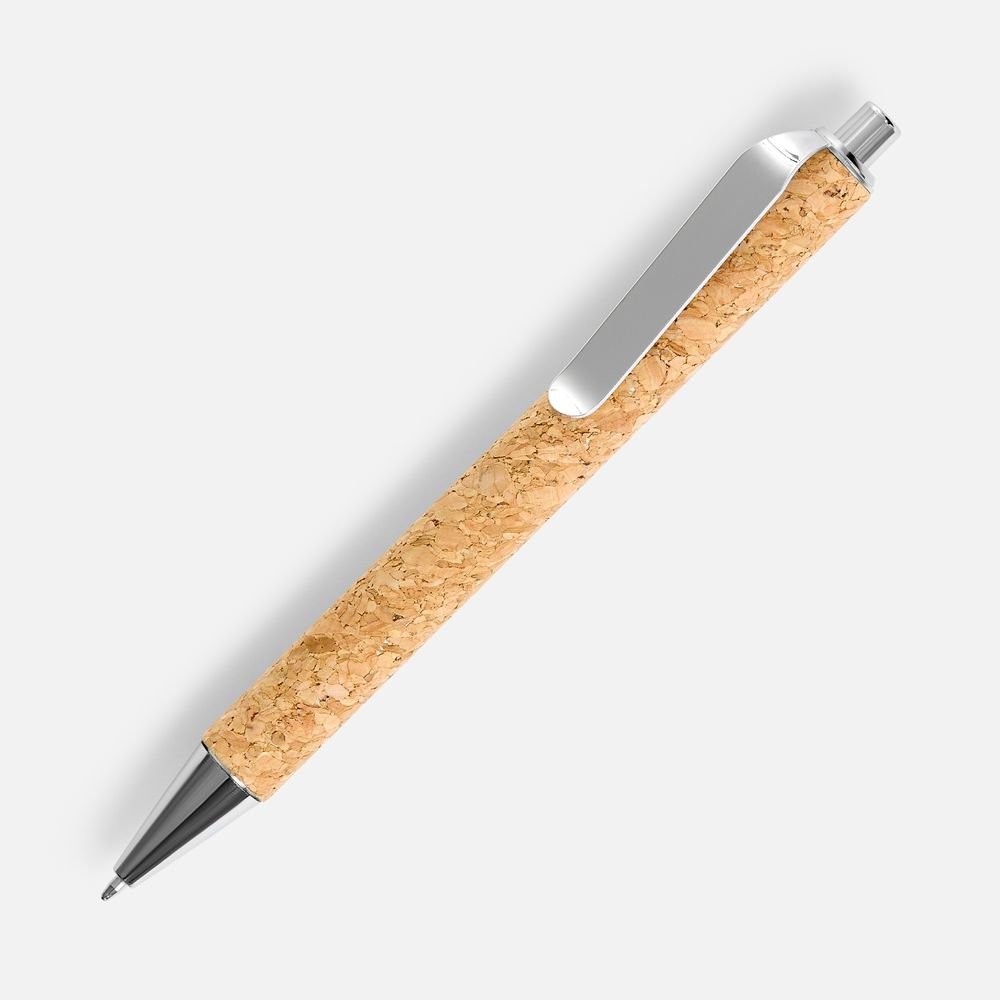 Шариковая ручка с корпусом из пробки крупной текстуры и широким металлическим клипом для нанесения логотипа.