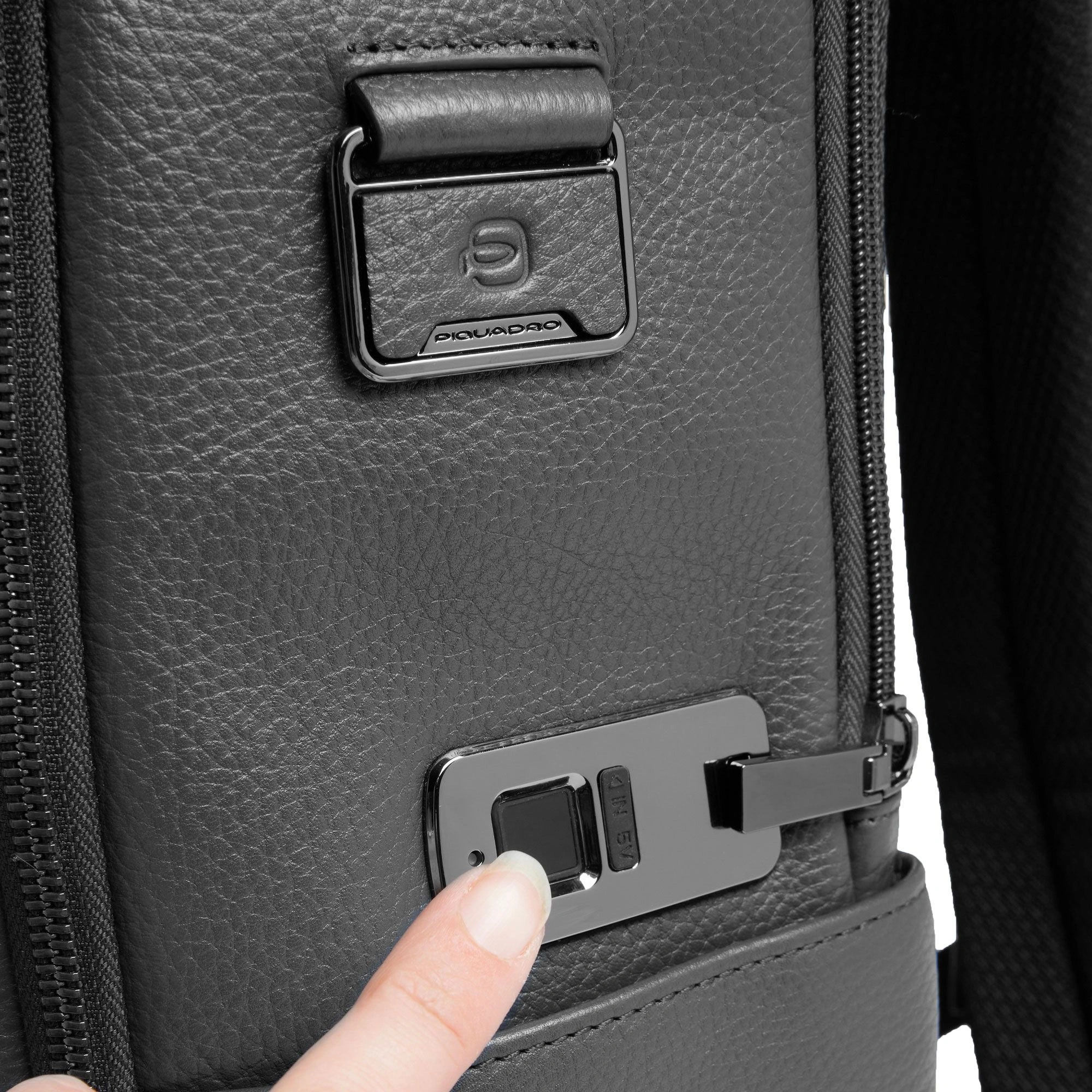 Описание:Персонализируемый дорожный рюкзак из кожи для ноутбука и iPad® с замком для защиты от отпечатков пальцев, грудинным ремнем, RFID и амортизирующей защитой