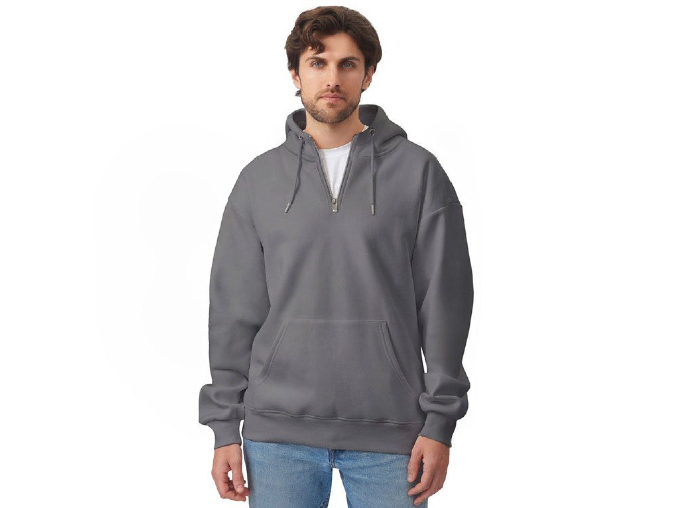 Худи с капюшоном ворот на молнии. Шнур в капюшоне с металлическими наконечниками. Отделка горловины спинки внутри тесьмой, Риб 2х2 по низу изделия и манжетам. Удобный карман кенгуру.
