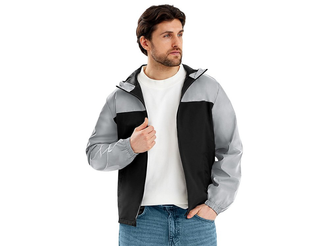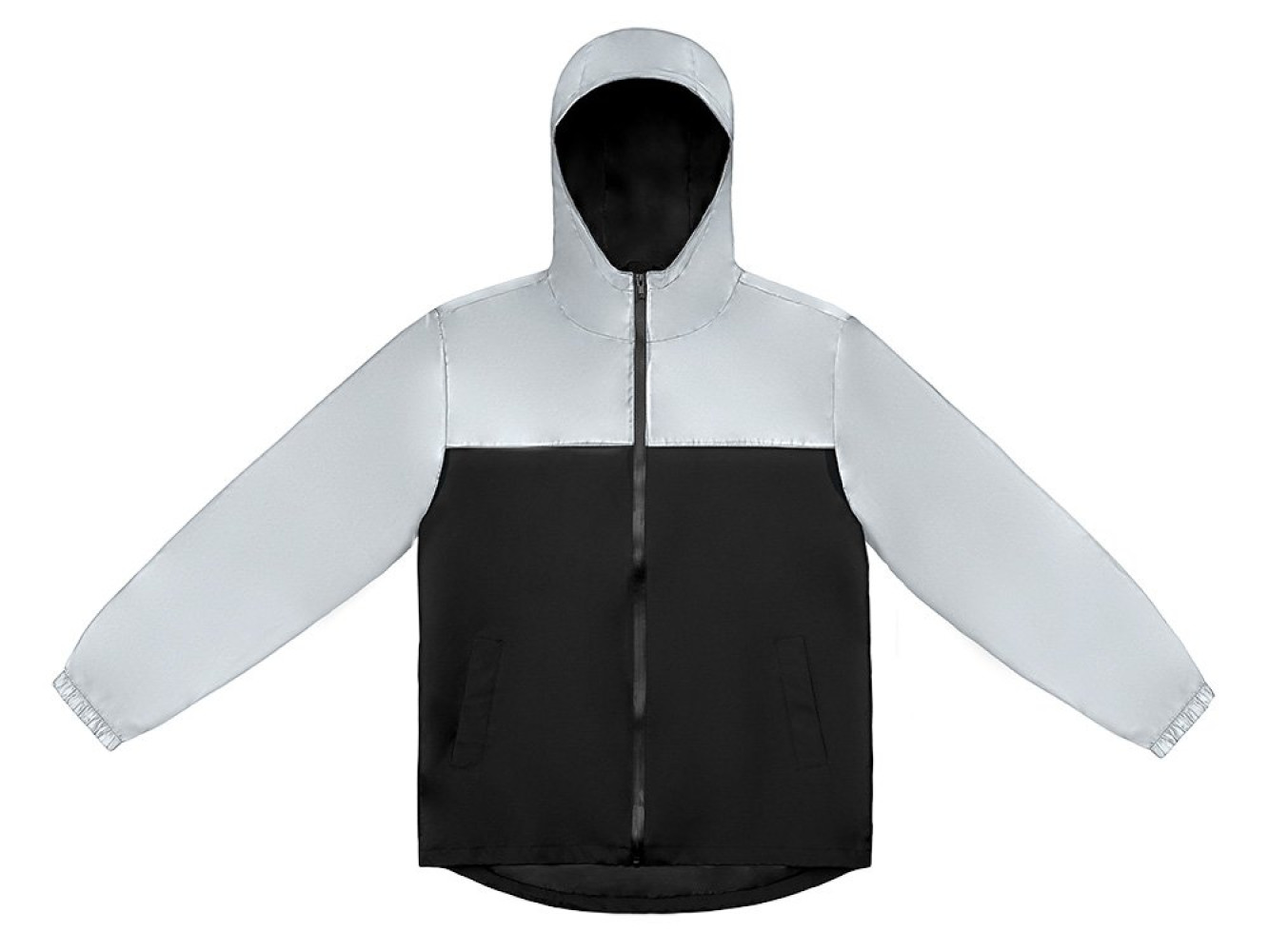 Streetwear-ветровка с контрастным дизайном: верх переда и спинки, рукава и капюшон — из светоотражающей ткани, низ — из прочной чёрной полиэстеровой ткани. Модель на подкладке, со спинкой длиннее переда. Детали: водонепроницаемая молния, боковые наклонные карманы с листочкой, манжеты на резинке, удобный капюшон, кулиска по низу. • Заметность в темноте — светоотражающая верхняя часть повышает безопасность. • Защита от ветра и дождя — влагостойкая молния и плотная ткань. • Комфортная посадка — удлинённая спинка и подкладка для межсезонья. • Универсальный городской стиль — легко сочетается с повседневным гардеробом.