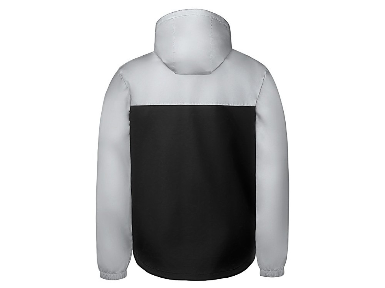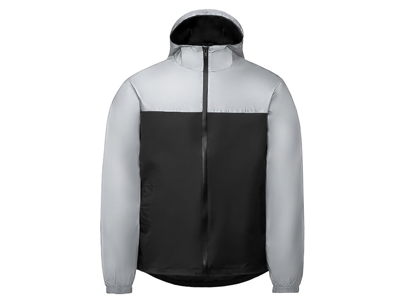 Streetwear-ветровка с контрастным дизайном: верх переда и спинки, рукава и капюшон — из светоотражающей ткани, низ — из прочной чёрной полиэстеровой ткани. Модель на подкладке, со спинкой длиннее переда. Детали: водонепроницаемая молния, боковые наклонные карманы с листочкой, манжеты на резинке, удобный капюшон, кулиска по низу. • Заметность в темноте — светоотражающая верхняя часть повышает безопасность. • Защита от ветра и дождя — влагостойкая молния и плотная ткань. • Комфортная посадка — удлинённая спинка и подкладка для межсезонья. • Универсальный городской стиль — легко сочетается с повседневным гардеробом.