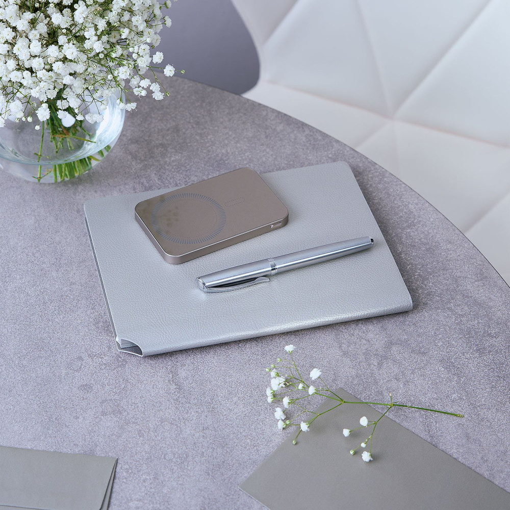 Удобный держатель для ручки, расположенный на корешке, делает этот
