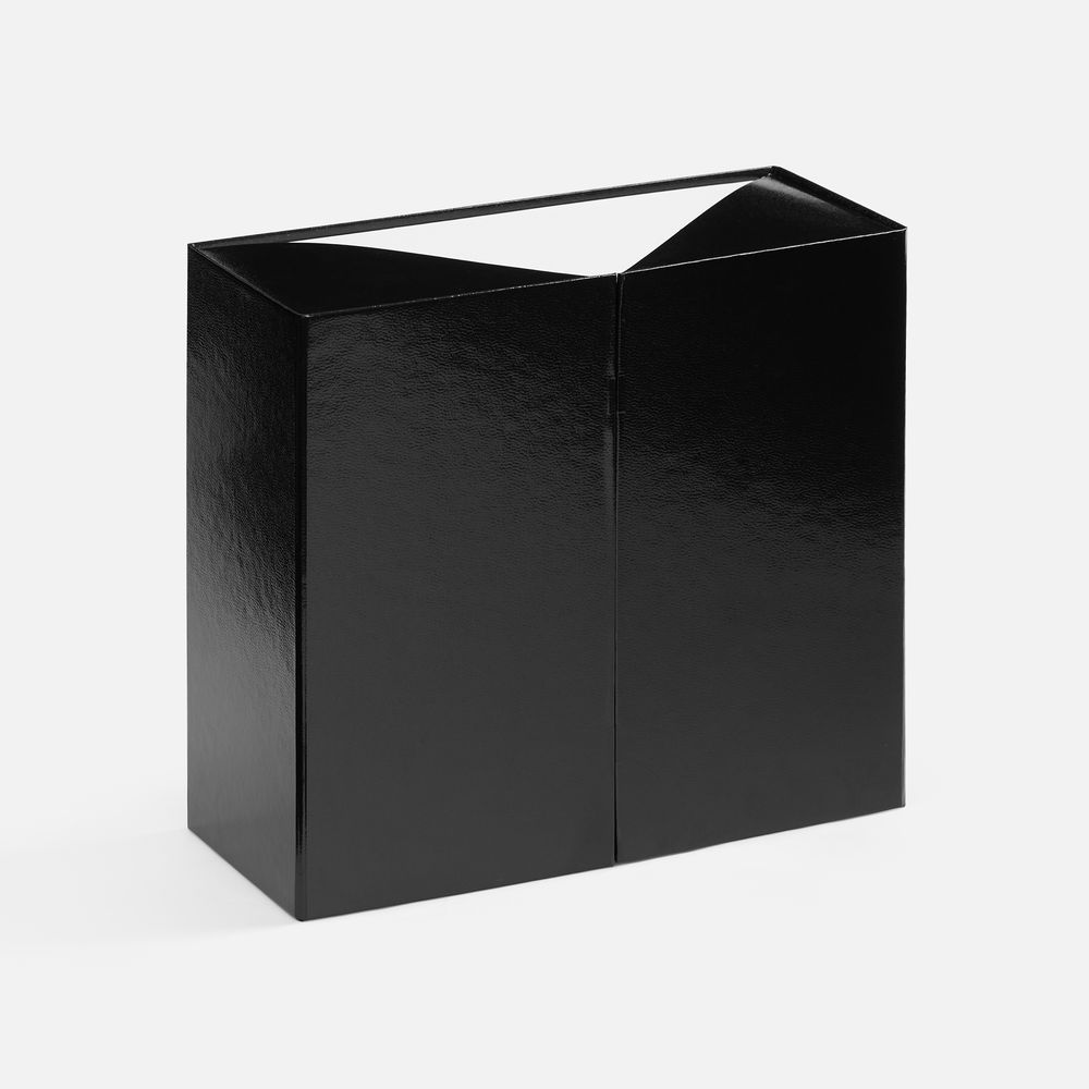 Коробка из переплетного картона 2 мм с оригинальной конструкцией: две симметричные створки открываются, создавая эффектную презентацию содержимого. Складная система на предустановленный двусторонний скотч делает сборку коробки быстрой и интуитивно понятной.