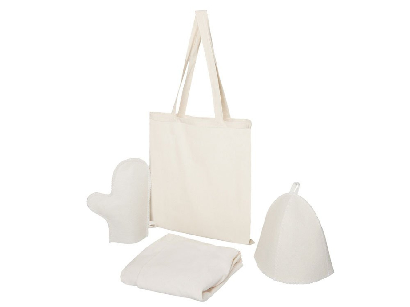 Создайте уют в парной: женский холщовый килт, шапка и рукавица — всё необходимое для отдыха, аккуратно сложено в хлопковый шоппер.