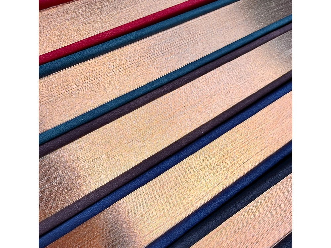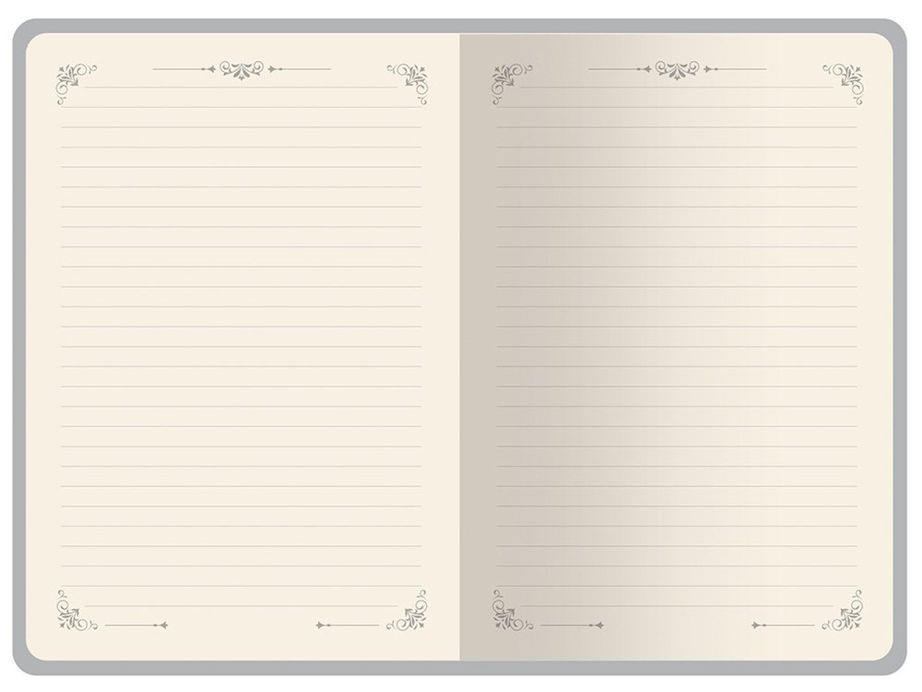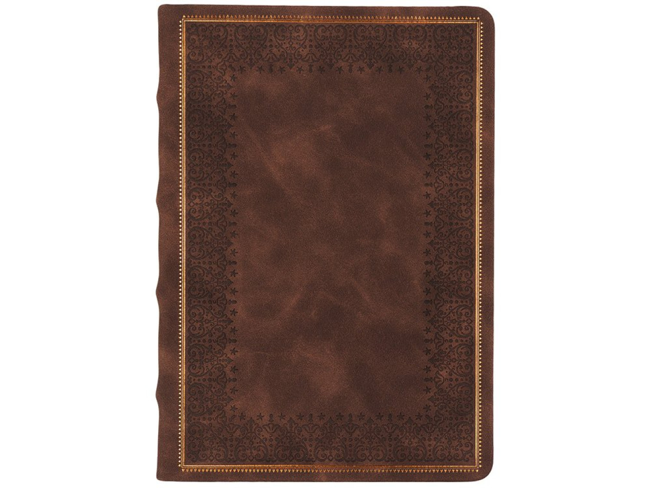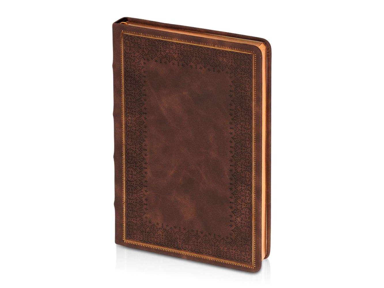 Недатированный ежедневник "Royal" формата А5 с твердой обложкой из искусственной кожи с имитацией нубука украшен художественным бронзовым и блинтовым тиснением. Внутри 256 страниц, выполненных из качественной бежевой бумаги в линейку плотностью 100 г/м². Два шелковых ляссе в цвет обреза блока и обложки облегчают навигацию по записям. Французский корешок дополнительно декорирован изящным бронзовым тиснением в виде виньеток. Скругленные углы обложки и блока подчеркивают стильный дизайн изделия, а блеск бронзового обреза дарит ежедневнику благородный и роскошный внешний вид.