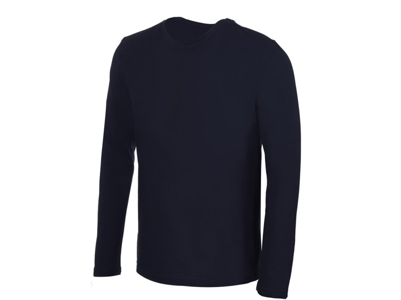 Футболка с длинным рукавом комфортной посадки с боковыми швами. Горловина обработана рибом 1х1 и тесьмой по спинке. Футболка выполнена из хлопкового джерси.