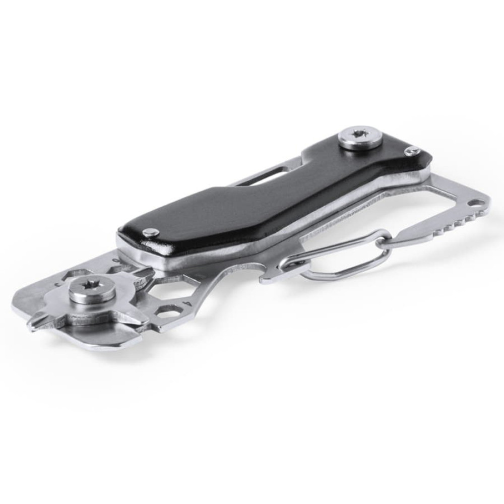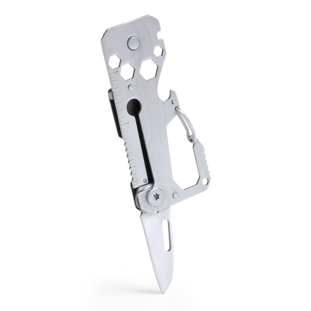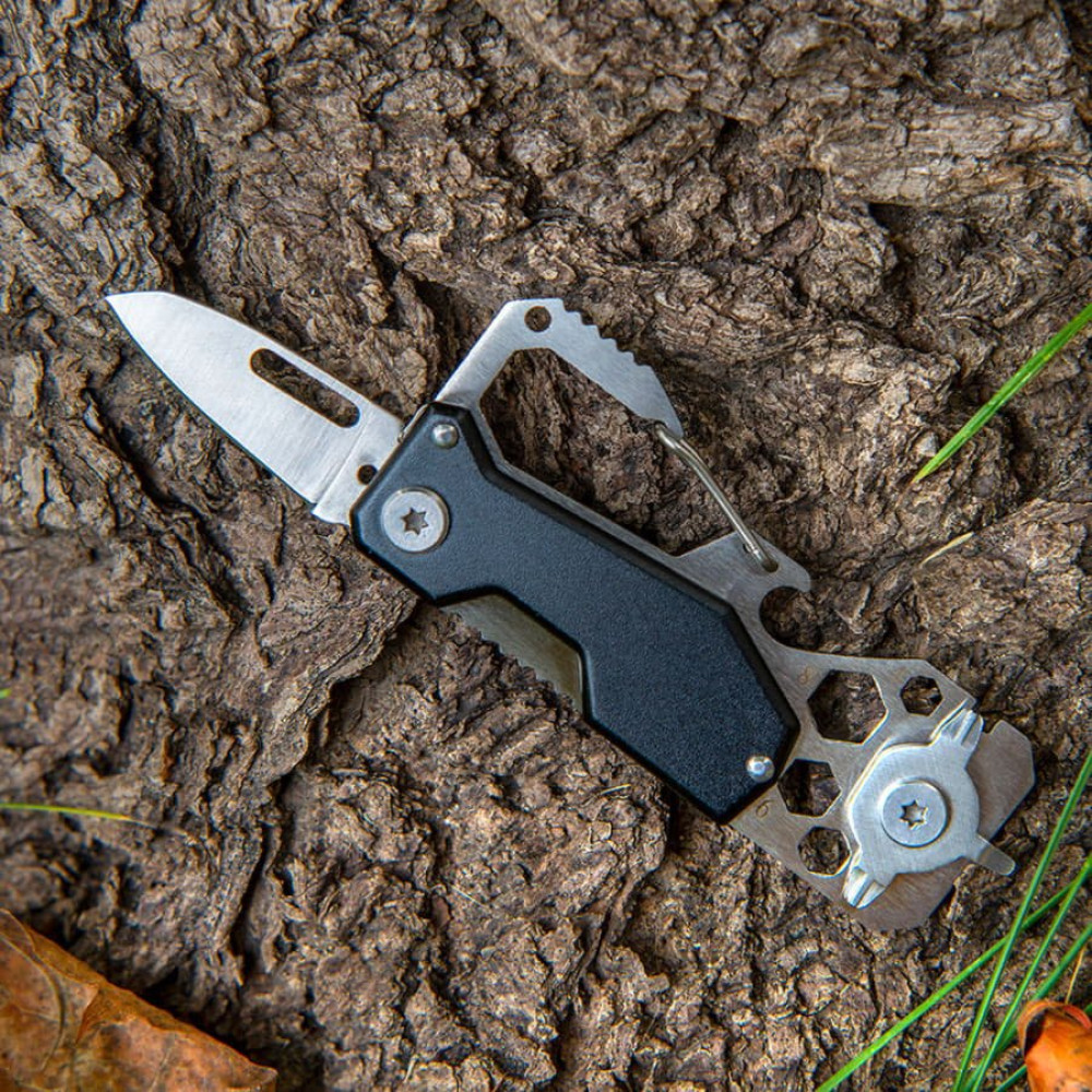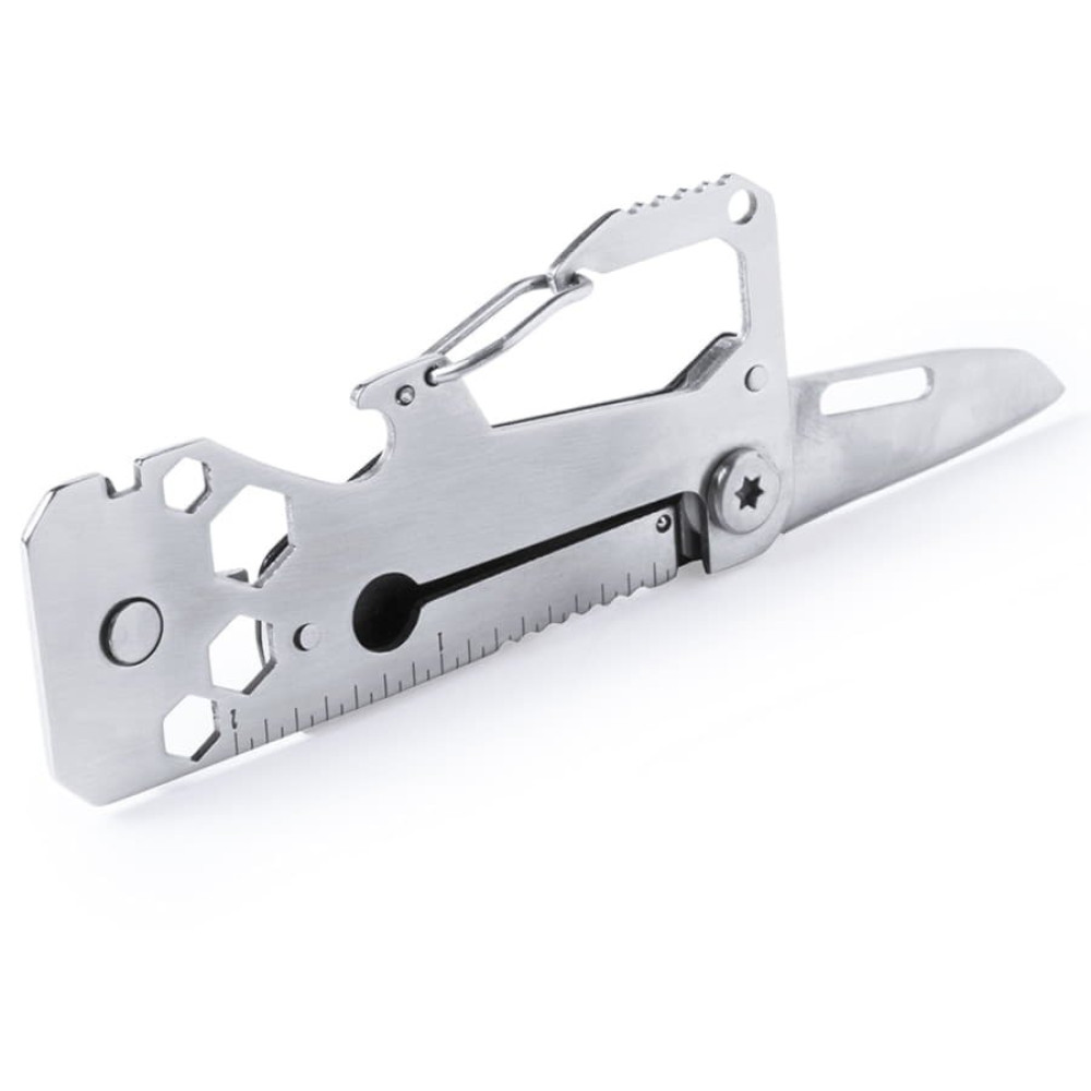 Универсальный инструмент в прочном корпусе из нержавеющей стали с 13 функциям: консервным ножом, ножом, отвертками, линейкой, открывалкой для бутылок, ключами для гаек, пилой и карабином. Поставляется в индивидуальной коробке.