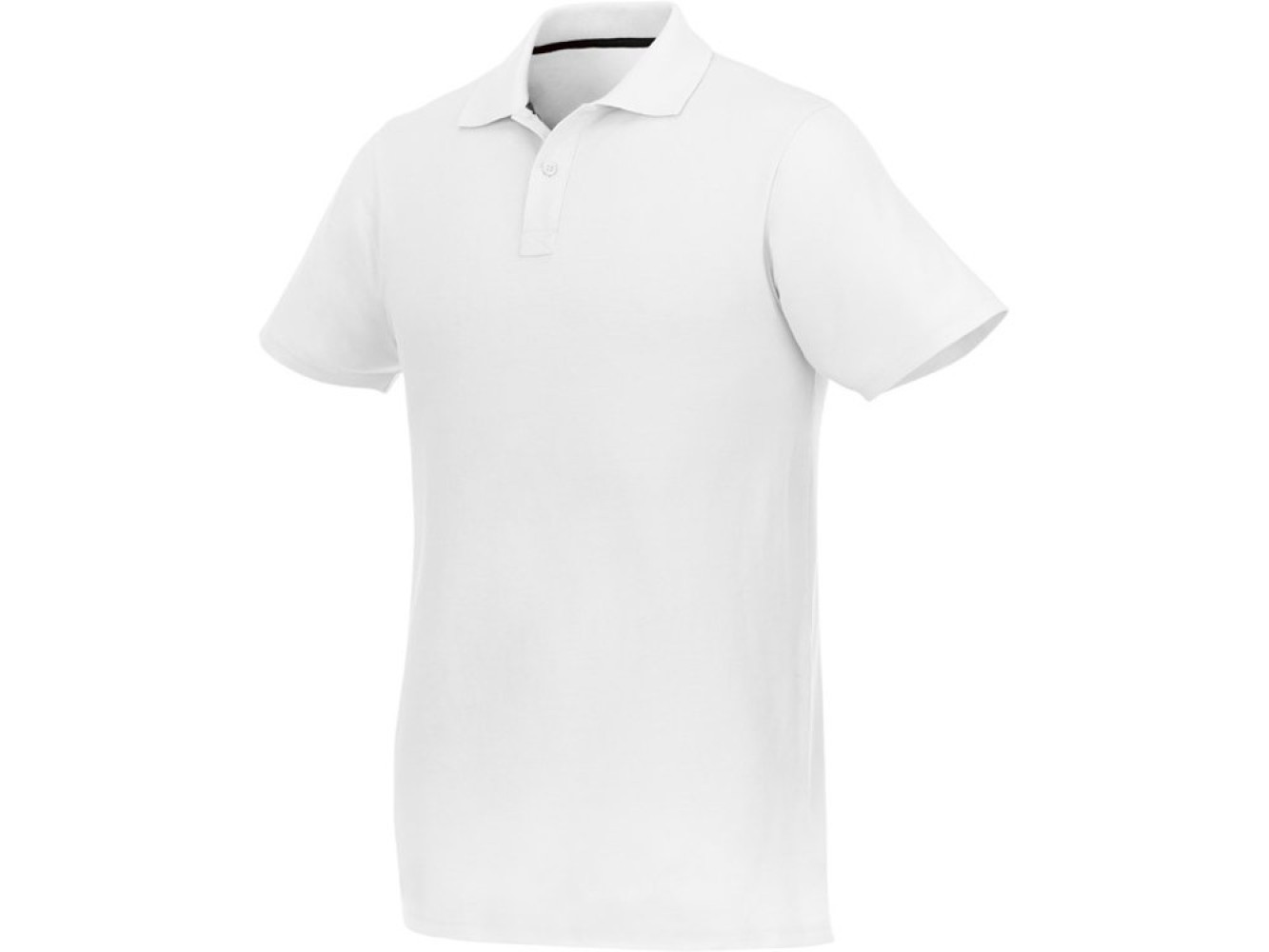 Мужское поло Helios с коротким рукавом. Отрезной-отрывной ярлык для комфорта. Воротник гладкой вязкой в рубчик. Планка с двумя пуговицами. Двойная строчка на воротнике и внизу изделия. Пуговицы в цвет изделия. Полоска на горловине в контрастном цвете. Трикотаж Piqué, 100 % хлопок. 180 г/м².