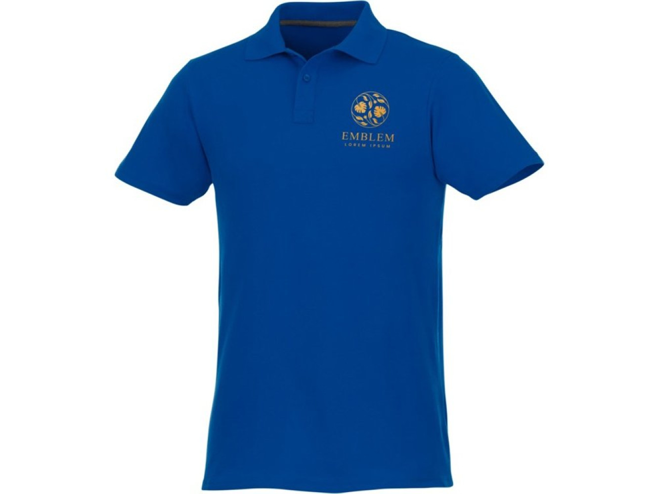 Мужское поло Helios с коротким рукавом. Отрезной-отрывной ярлык для комфорта. Воротник гладкой вязкой в рубчик. Планка с двумя пуговицами. Двойная строчка на воротнике и внизу изделия. Пуговицы в цвет изделия. Полоска на горловине в контрастном цвете. Трикотаж Piqué, 100 % хлопок. 180 г/м².