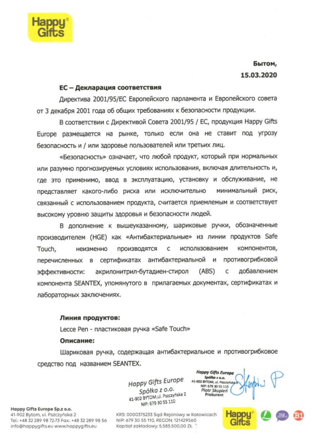 пластика, из которого производятся ручки SafeTouch, подтверждены