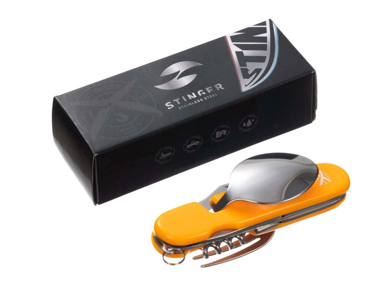 Нож перочинный STINGER имеет 8 функций: 1. Лезвие 2. Ложка 3. Вилка