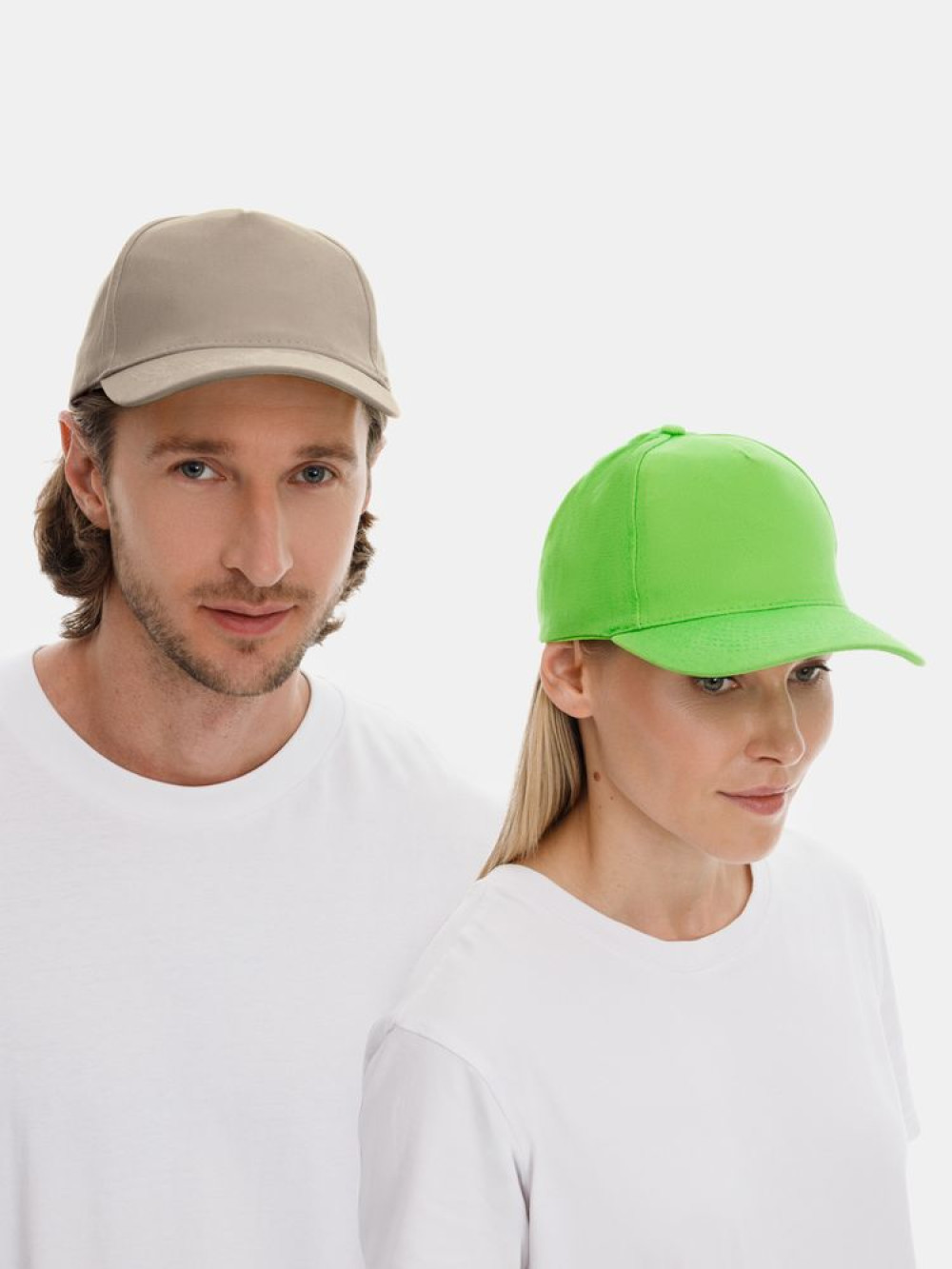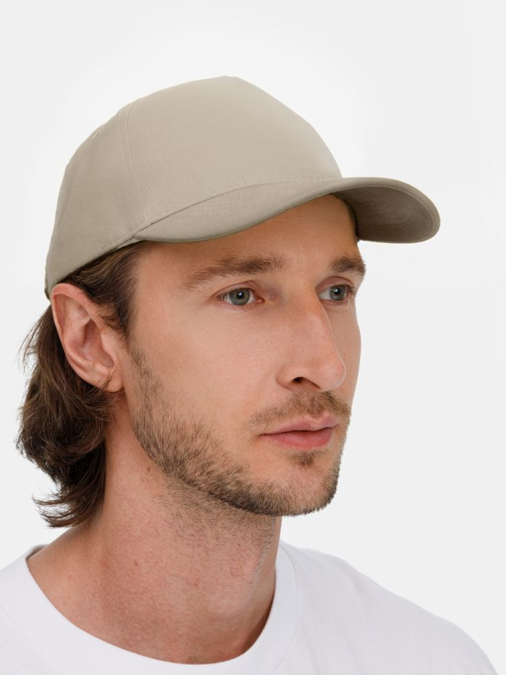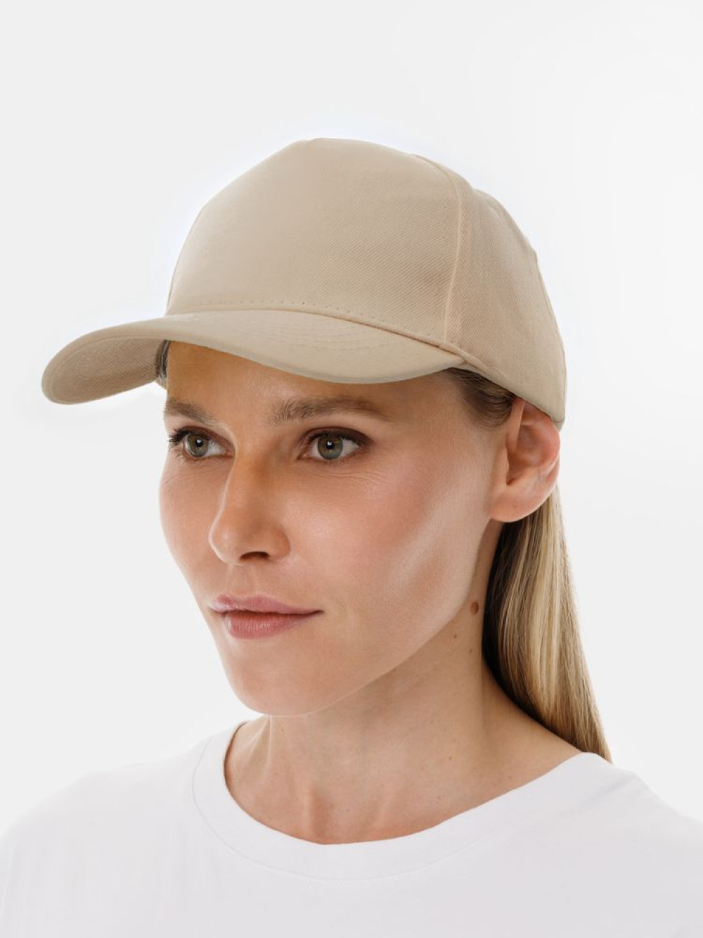 Модель бейсболки с 5-ю клиньями без лобового шва из плотного чесаного хлопка.