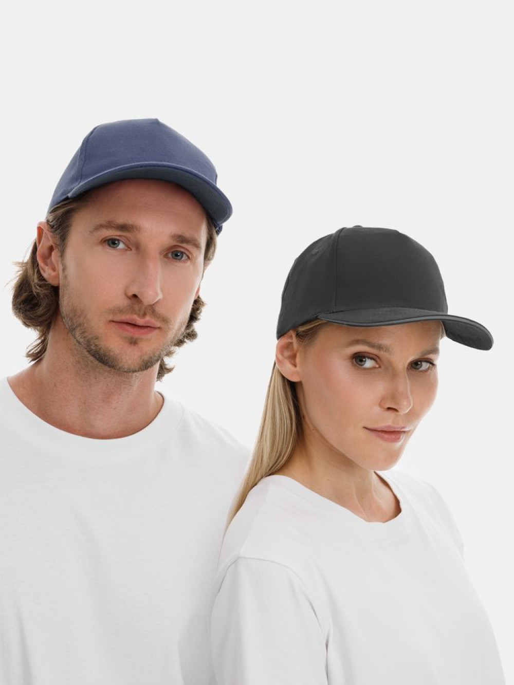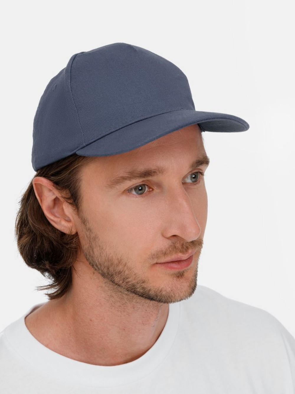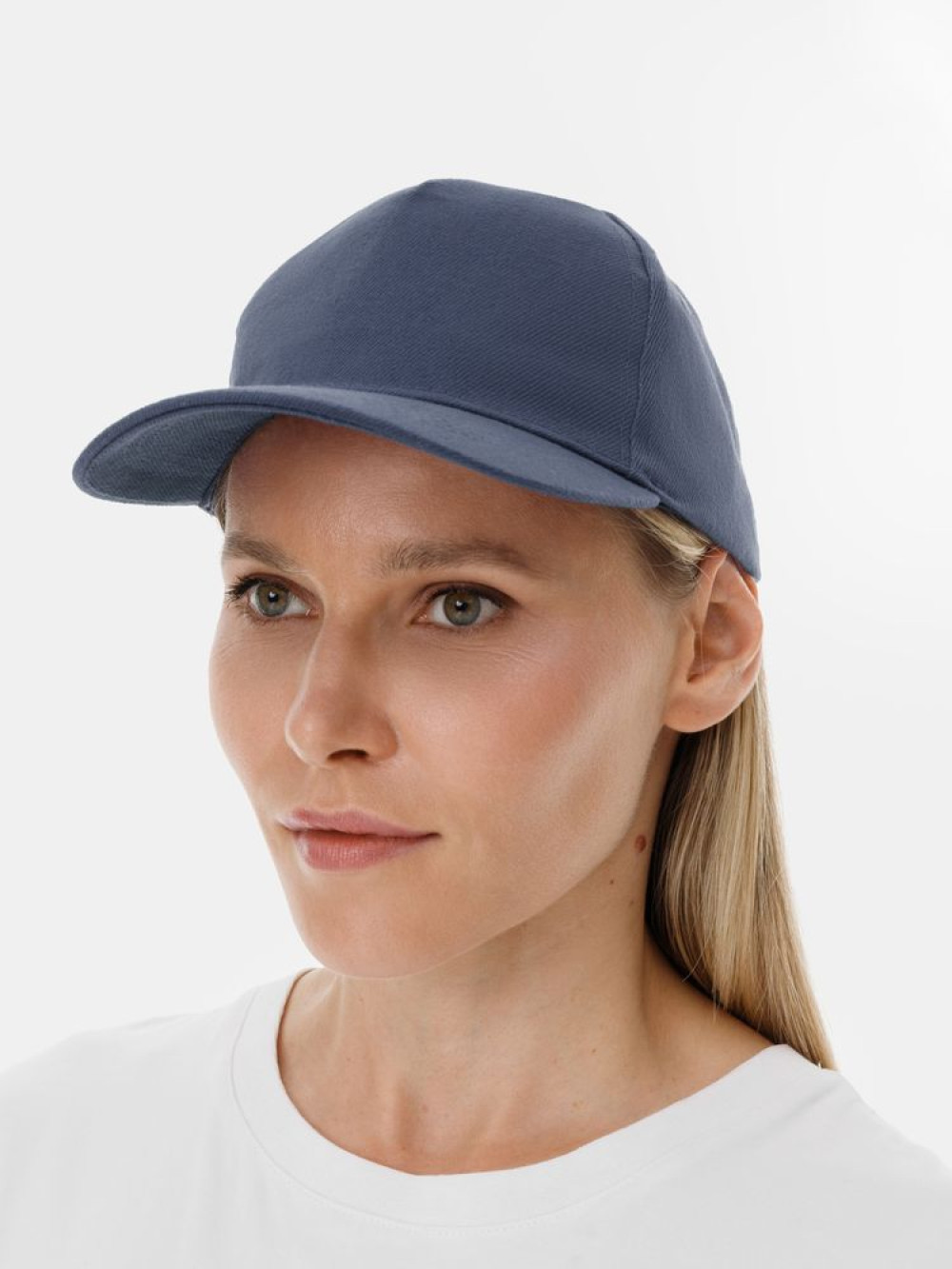 Модель бейсболки с 5-ю клиньями без лобового шва из плотного чесаного хлопка.