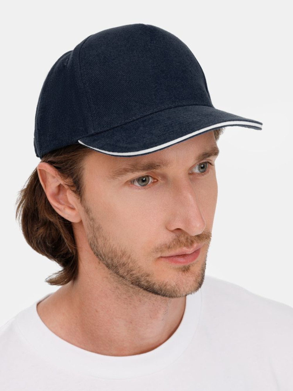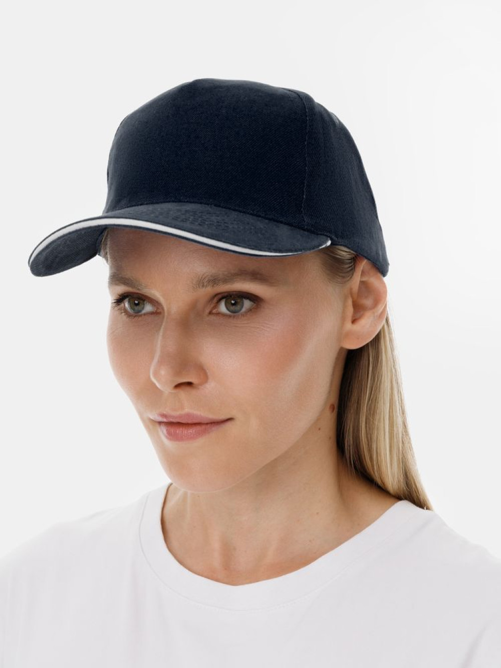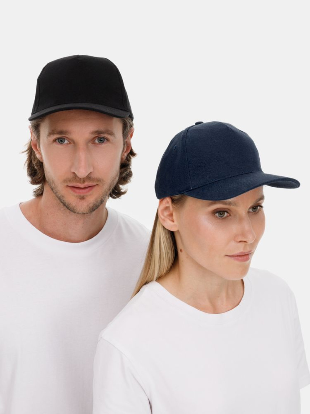 Модель бейсболки с 5-ю клиньями без лобового шва из плотного чесаного хлопка.