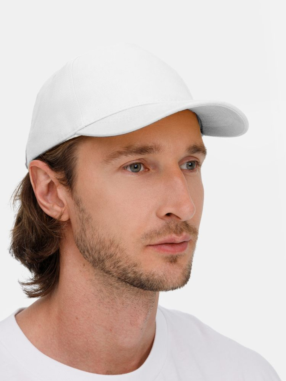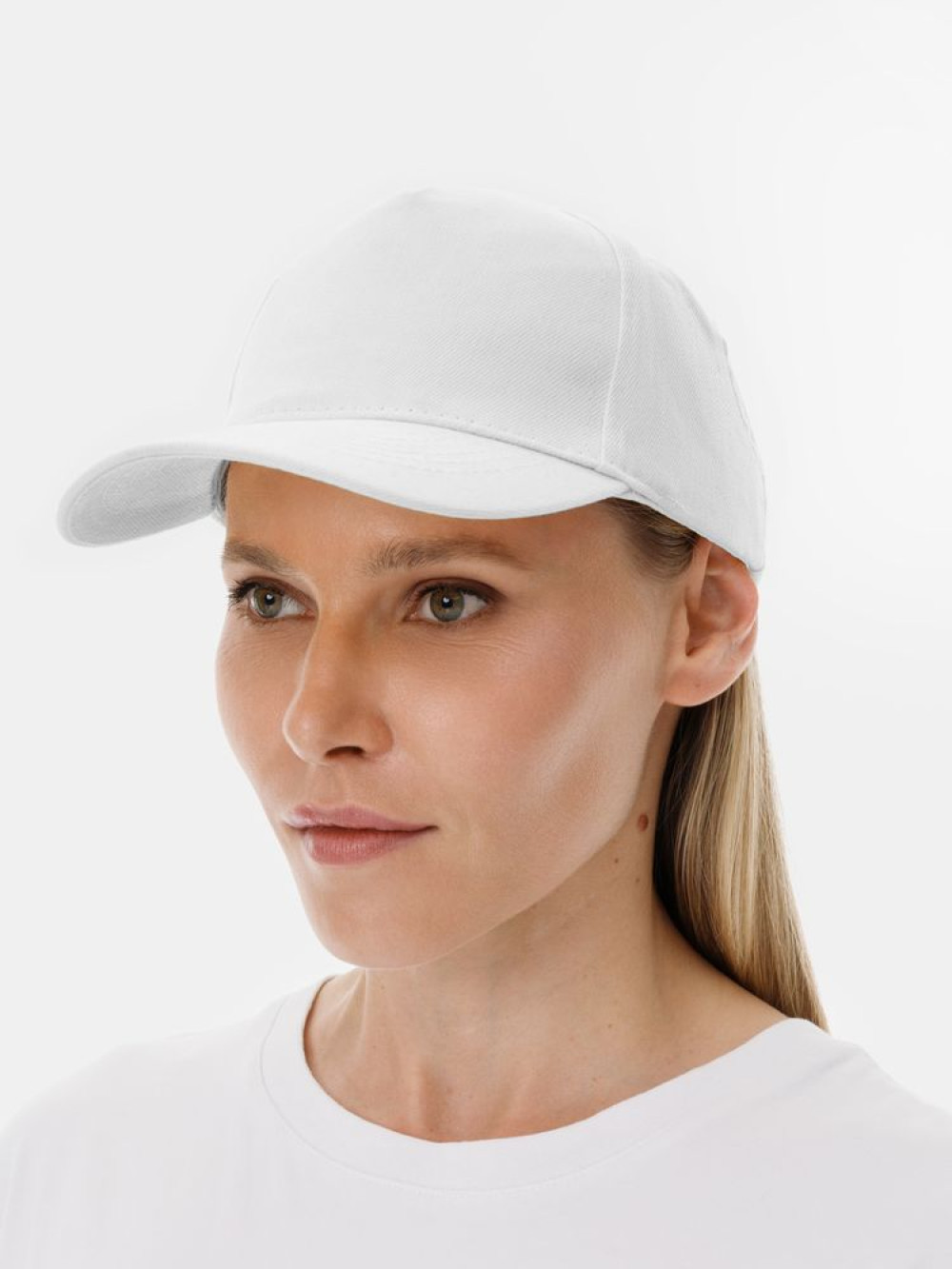 Модель бейсболки с 5-ю клиньями без лобового шва из плотного чесаного хлопка.